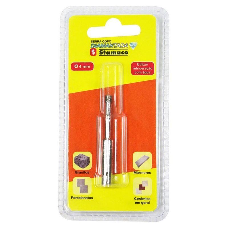 Serra Copo Diamantada 4mm - 1744 - Stamaco Serra Copo Diamantada 4mm Stamaco 174.4Serra Copo Diamantada 4mm ? 1744 ? STAMACO- Serra copo diamantada 4 mm.- Aresta de corte revestida com diamante, permanentemente ligada a um corpo de aço resistente,proporciona suficiente folga para cortar a altas velocidades.- RPM (Rotação Máxima): 3.800.- Máquina de uso: furadeira.- Aplicações recomendadas: granitos, mármores, pedras, porcelanato com água e revestimentos.- Recomendável uso com água.- Nunca utilizar o sistema de impacto da máquina.Tamanho - 4mmmeli_shipping_mode - me1