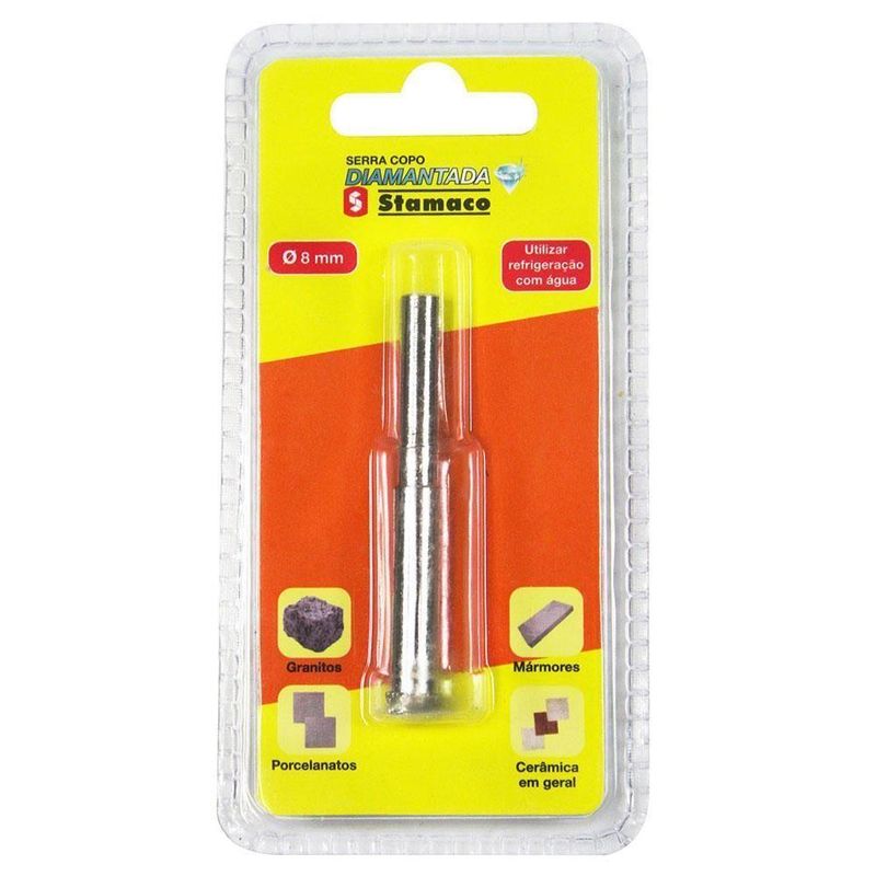 Serra Copo Diamantada 8mm - 1768 - Stamaco Serra Copo Diamantada 8mm Stamaco Serra Copo Diamantada 8mm ? 1768 ? STAMACO- Serra copo diamantada 8 mm.- Aresta de corte revestida com diamante, permanentemente ligada a um corpo de aço resistente, proporciona suficiente folga para cortar a altas velocidades.- RPM (Rotação Máxima): - Máquina de uso: furadeira.- Aplicações recomendadas: granitos, mármores, pedras, porcelanato com água e revestimentos.- Recomendável uso com água.- Nunca utilizar o sistema de impacto da máquina.Tamanho - 8mmmeli_shipping_mode - me1
