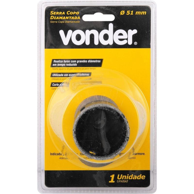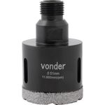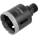 Serra Copo Diamantada Para Esmerilhadeira 51 Mm VonderRef. Fornecedor: 3617200051Marca: VonderConteúdo Embalagem:1 Serra copoDestaques e diferenciais:Corte a seco. Permite a realização de furos com grandes diâmetros em tempo reduzidoAplicações e dicas de uso:Serra copo diamantada para uso em telhas, tijolos, cerâmicas, azulejos, granito, mármore. Indicada para uso em esmerilhadeira com rosca interna M14 e rosca externa 1/2 BSP para máquinas estacionárias em marmorariaCaracterísticas Técnicas:Diâmetro da serra copo: 51 mm Altura útil aproximada da serra copo: 47 mm Comprimento total: 80,0 Diâmetro e tipo da rosca: M14 Rotação máxima (rpm): 11000 /min Produto: Serra