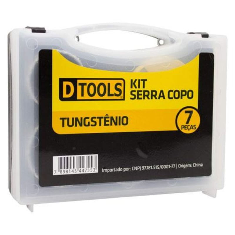Serra Copo Tungstênio Kit 7 Peças - DTOOLS para Alumínio, Alvenaria, Azulejos e Mais - Serra Copo Tungstênio Kit 7 Peças - DToolsCom o Kit 7 Peças de Serra Copo Tungstênio DTools, você terá em mãos a solução perfeita para os mais diversos trabalhos. Seja para furar alumÃnio, alvenaria, azulejos, madeira ou telha, este kit é versátil e eficiente, garantindo resultados precisos e de qualidade. Com fácil manuseio e a possibilidade de furar à seco ou com água, as serras copo deste kit são adaptáveis a qualquer furadeira, tornando o seu trabalho mais prático e eficiente. Além disso, o kit facilita a instalação de dutos de ventilação, condutores elétricos, canos, tubulações, ralos, encanamentos, spots e muito mais. Acompanhando o kit, você encontrará 1 pino guia e uma base universal com capacidade para serras de 33, 53, 67, 73 e 83mm, garantindo que você tenha todas as ferramentas necessárias para realizar seus projetos com precisão e agilidade. - Kit com 7 peças de serra copo tungstênio- Ideal para trabalhos em alumÃnio, alvenaria, amianto, azulejos, blocos de concreto, chapas finas de latão, zinco e cobre, gesso, drywall, madeira, telha e tijolos- Fácil manuseio e adaptável a qualquer furadeira- Facilita a instalação de diversos tipos de dutos e tubulações- Contém 1 pino guia e base universal para serras de 33, 53, 67, 73 e 83mm Não perca mais tempo e adquira agora mesmo o Kit 7 Peças de Serra Copo Tungstênio DTools Universo do Lar e garanta qualidade e eficiência em seus projetos! -------- Descrição Original enviada pelo Fornecedor: SERRA COPO TUNGSTÃNIO KIT 7 PEÃAS - DTOOLSPara trabalhos em: alumÃnio; alvenaria; amianto; azulejos; blocos de concreto; chapas finas de latão, zinco e cobre; gesso; drywall; madeira; telha; tijolos.Fácil manuseioFura à seco ou com águaAdaptável a qualquer furadeiraFacilita a instalação de outros dutos de ventilação, condutores elétricos, canos, tubulações, ralos, encanamentos, spots, etc.contém: 1 pino guia, base universal com capacidade para serras de: 33,53,67,73 e 83mm Características Gerais do Produto: Garantia: • 3 meses