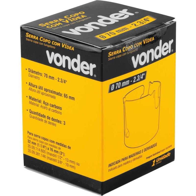 Código do Fornecedor: 3517070000Marca: Vonder Conteúdo da embalagem: 1 Serra Copo Vídeo 70mm 2.3/4'' Para Madeira VonderDestaques e diferenciais: Possui dentes de metal duro/vídea que proporcionam maior vida útil. Permite a realização de furos com grandes diâmetros em tempo reduzido. O número de dentes pode variar de acordo com o diâmetro da serra copo.Aplicações e dicas de uso: Indicada para madeiras e derivados. Utilizar suporte/haste apropriados (não acompanham).Garantia legal: 90 diasDetalhes TécnicosDiâmetro: Ø70 mm - 2.3/4" Altura útil aproximada: 65 mm Massa aproximada (peso) (kg): 0,254 kg