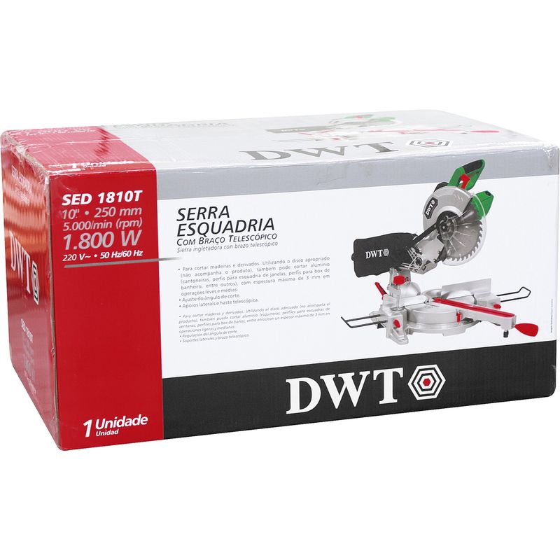 Marca: DWTConteúdo da Embalagem:1 Serra esquadria. Acompanha: 1 coletor de pó, 1 chave allen e 1 lâmina de serra para madeiraDestaques e diferenciais:Possui base giratória para cortes em ângulo de 45° para ambos os lados, braço (cabeça de corte) com botão para regulagem de inclinação de até 45° para a esquerda, cabo com revestimento emborrachado e eixo com protetor de lâmina. Contém braço telescópico e mesa extensora que permitem cortar peças com dimensões maiores e com os mais variados ângulos.Aplicações e dicas de uso:Indicada para cortar madeiras e derivados. Utilizando a lâmina apropriada (não acompanha), também pode cortar cantoneiras e esquadrias de alumínio com espessura máxima de 3 mm em operações leves e médias.Características Técnicas:Diâmetro da serra indicada: 10" - 254 mm Potência (W): 1.800 W Tensão (V): 220 V Rotação (rpm): 5.000/min Ângulo de inclinação da serra de esquadria: Base com ângulo de 45º
