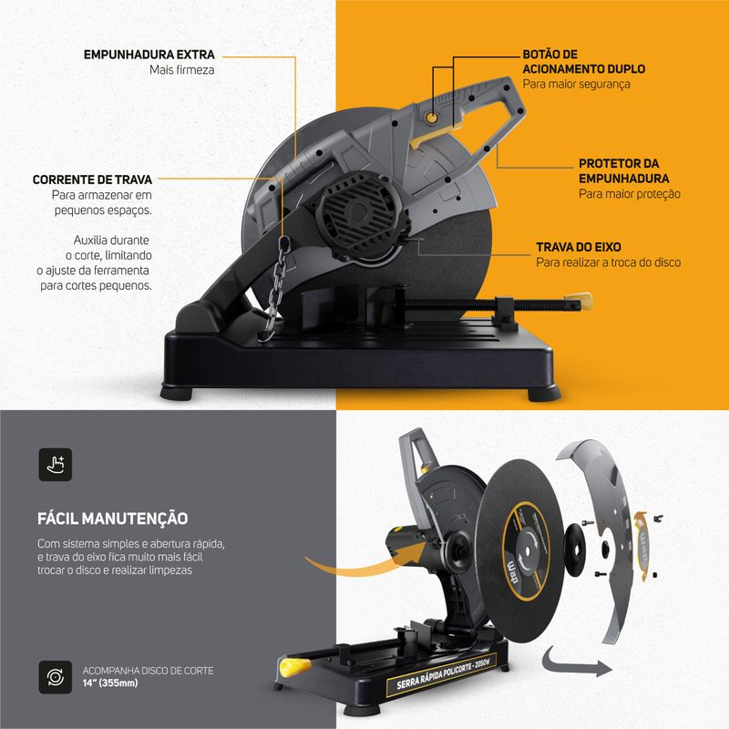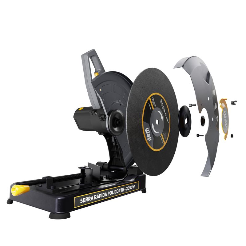 Código do Fornecedor: FW010126 Marca: Wap Conteúdo da embalagem: 1 Serra Rápida Portátil 355mm 2050W 127V WFSP01 Wap DADOS TÉCNICOS: Cor: Cinza, Amarelo e PretoPotência: 2050WTensão: 127VRotação Máxima: 38000 RPMDiâmetro do disco: 355mm - 14"Eixo (furo): 25,4mm - 1"Angulação da regulagem da base: 90° a 45°Comprimento do cordão de alimentação: 1,80 mBotão de travamento: SimClasse de Proteção: Classe IIEmissão de vibração: 3 (m/s²)Capacidade de corte: 127 mmMaterial da base: AçoGarantia: 01 ANO ACESSÓRIOS: 1 Disco de corte1 Chave para soltar o disco1 Par de escovas COMPONENTES: Botão de acionamento duploCorrente limitadora de aberturaBotão liga e desligaPorta escovas removive DIMENSÕES: Dimensões do Produto Montado CxLxA: 27 x 63 x 55 cmPeso Líquido Produto: 10,5 kg Composta por um disco de corte 14” e velocidade de até 3800 RPM, a Serra Policorte WAP á a melhor escolha para proporcionar cortes precisos. Indicada para cortes em aço, metal e ferro, a morsa de aperto de trabalho ajustável é extremamente versátil em suas aplicações. Com um ajuste de regulagem de 90° a 45°. Sua potência de 2050W, a Serra Rápida Policorte WAP é ideal para trabalhar com metais. O protetor de empunhadura e a trava de eixo, conferem um excelente desempenho em tarefas exigentes do dia a dia. Parceira para trabalhos que exigem precisão, o equipamento permite o acesso fácil à troca de disco, simplificando a substituição das escovas de carvão e a regulagem do tamanho das peças. Além da empunhadura extra, seu botão duplo, e o protetor metálico protege a prática de corte dos profissionais em projetos de médio e grande porte. Ajuste com facilidade o corte de tubos, barras e perfis de até um diâmetro máximo de 127mm, com alta potência.