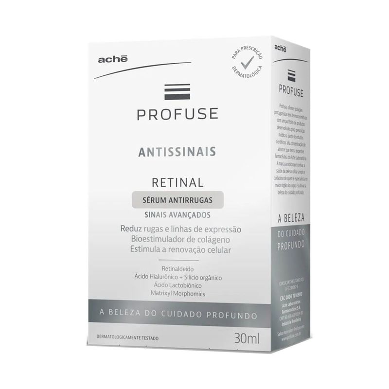Sérum Antirrugas Profuse Retinal Antissinais 30ml Tratamento antissinais avançado para uma pele visivelmente mais firme e rejuvenescida. O Sérum Antirrugas Profuse Retinal Antissinais foi desenvolvido para cuidar da pele madura, combatendo rugas profundas, linhas de expressão e outros sinais intensos do envelhecimento. Para que serve o Sérum Antirrugas Profuse Retinal Antissinais? O Profuse Antissinais Retinal serve para tratar os sinais avançados do envelhecimento da pele, como rugas, flacidez e perda de elasticidade. Sua fórmula com retinal atua como um potente bioestimulador de colágeno, promovendo renovação celular, firmeza e uma aparência mais jovem, uniforme e revitalizada. Descrição do Produto O Sérum Antirrugas Profuse Retinal Antissinais 30ml é um dermocosmético de alta performance indicado para quem busca um tratamento antienvelhecimento eficaz. Sua fórmula avançada auxilia na regeneração da pele, melhora a textura e suaviza rugas e linhas de expressão. Possui textura leve e rápida absorção, ideal para integrar a rotina diária de cuidados com a pele madura. Como usar Aplique o sérum diariamente, pela manhã ou à noite, no rosto, pescoço e colo, com a pele limpa e seca. Massageie suavemente até completa absorção. Utilize conforme orientação médica. Para melhores resultados, recomenda-se o uso contínuo e o acompanhamento com um dermatologista. Composição Fórmula com Retinal e ativos dermocosméticos que auxiliam na renovação celular, estímulo de colágeno e melhora da firmeza da pele. Advertências Uso externo; Evite contato com os olhos; Em caso de irritação, suspenda o uso e procure orientação médica; Manter fora do alcance de crianças; Consulte um dermatologista antes de iniciar o uso de produtos com ativos antissinais. Principais Benefícios Combate sinais intensos do envelhecimento da pele madura; Reduz rugas e linhas de expressão; Bioestimulador de colágeno; Melhora a firmeza e a elasticidade da pele; Estimula a renovação celular; Textura leve e rápida absorção; Ideal para uso diário.