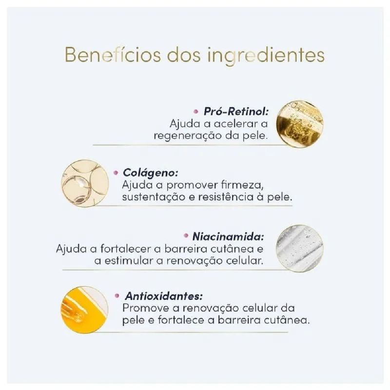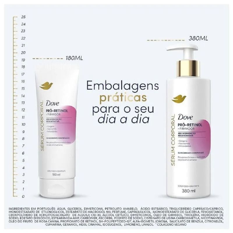 Sérum Hidratante Corporal Dove Pró-Retinol + Firmador 180ml O que é? O Sérum Hidratante Corporal Dove Pró-Retinol + Firmador é uma inovação em cuidados para pele seca e com flacidez. Com fórmula exclusiva desenvolvida com dermatologistas, promove hidratação profunda por até 48 horas e estimula a renovação celular para restaurar a firmeza, elasticidade e luminosidade natural da pele. Enriquecido com Pró-Retinol, Colágeno Vegano, Niacinamida e Antioxidantes, este sérum corporal vai além da hidratação tradicional. Ele age diretamente na estrutura da pele, proporcionando sustentação, firmeza e uma aparência visivelmente mais saudável. Sua textura leve, de rápida absorção e não oleosa, é ideal para o uso diário. Indicado especialmente para quem busca um hidratante firmador com retinol para combater os sinais da flacidez e ressecamento. Testado clinicamente em peles reais e não testado em animais, o Sérum Dove é uma excelente escolha para quem procura eficácia com um cuidado consciente. Para que serve? O Dove Sérum Hidratante Corporal Pró-Retinol foi desenvolvido para: Garantir 48 horas de hidratação intensa e regenerativa Estimular a produção natural de colágeno e renovação celular Combater a flacidez e a perda de elasticidade da pele Restaurar a luminosidade e melhorar o aspecto da pele seca Hidratar profundamente sem deixar a pele oleosa Como funciona? A tecnologia presente neste sérum combina ativos de alta performance com ação dermatologicamente comprovada: Pró-Retinol: promove a renovação celular e atua no combate à flacidez Colágeno Vegano: melhora a sustentação, firmeza e resistência da pele Niacinamida: ativa o colágeno natural e contribui para maior elasticidade Antioxidantes: reforçam a barreira cutânea e protegem contra agressões externas Benefícios principais Hidratante corporal com ação firmadora e Pró-Retinol Pele visivelmente mais firme, nutrida e iluminada Fórmula leve e de absorção rápida, ideal para o dia a dia Ativos poderosos como colágeno vegetal, niacinamida e antioxidantes Dermatologicamente testado e cruelty free Modo de usar Aplicar o produto diariamente sobre a pele limpa, com movimentos suaves até a completa absorção. Recomendado especialmente após o banho ou sempre que a pele estiver ressecada. Armazenamento Manter o produto em local seco, arejado e protegido da luz solar direta. Precauções Uso externo. Evite contato com os olhos. Em caso de irritação, suspenda o uso e procure orientação médica. Informações adicionais do Fabricante O novo Dove Sérum Hidratante Corporal Pró-Retinol, com efeito firmador, atua além da hidratação para estimular a regeneração da pele e restaurar sua luminosidade natural. Este hidratante corporal com retinol oferece 48h de hidratação regenerativa, com ativos de alta potência, como Colágeno Vegano*, que ajuda a promover firmeza, sustentação e resistência da pele; Niacinamida, que estimula a produção de colágeno, melhorando a elasticidade e firmeza; e Antioxidantes, que apoiam a renovação celular da superfície da pele e fortalecem a barreira cutânea.Desenvolvido em parceria com dermatologistas e testado em mulheres reais, o hidratante corporal Dove Pró-Retinol possui uma tecnologia exclusiva e avançada que hidrata profundamente e atua em sinergia com a pele, ajudando a restaurar sua firmeza e elasticidade natural de dentro para fora.Está clinicamente comprovado que o Dove Sérum Hidratante Corporal Pró-Retinol recupera a firmeza e elasticidade da pele.Sua fórmula leve e não oleosa, de fácil aplicação e absorção imediata, é indicada para a pele com flacidez e seca. Use diariamente em todo o corpo como alternativa ao seu creme corporal tradicional para manter a pele hidratada, perfumada e ajudar a promover o equilíbrio do microbioma da pele.Globalmente, Dove não testa seus produtos em animais.A linha de Séruns Deo Hidratantes Dove combina ativos de alta potência que oferecem o cuidado que sua pele necessita. Escolha o Dove Sérum Hidratante Corporal Pró-Retinol que melhor atende às necessidades da sua pele.Dove. Cuide-se. Proteja-se. Pela beleza sem padrões!*Colágeno de origem vegetal Benefícios ? Hidratante corporal com pró-retinol e efeito firmador para pele seca e com flacidez? 48h de hidratação regenerativa ? Fórmula enriquecida com colágeno vegano*, niacinamida e antioxidantes ? Estimula a regeneração da pele e restaura a luminosidade natural? Creme com textura leve, não oleosa, de rápida absorção e fácil aplicação.