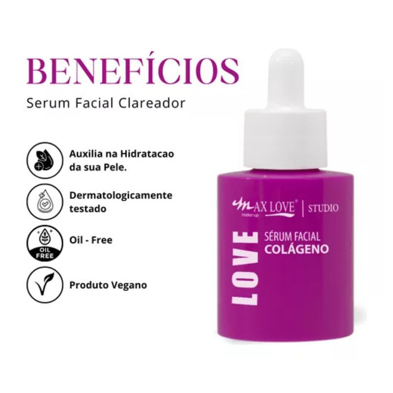 O Sérum Facial Colágeno da Max Love é um tratamento intensivo formulado para ajudar a restaurar a firmeza e elasticidade da pele, combatendo os sinais de envelhecimento. Enriquecido com colágeno, ele promove uma pele mais jovem, hidratada e revitalizada, auxiliando na prevenção de flacidez e no rejuvenescimento facial. Principais benefícios: Aumento da firmeza e elasticidade: O colágeno ajuda a fortalecer a estrutura da pele, melhorando sua firmeza e prevenindo a flacidez. Redução das linhas finas e rugas: Com o uso contínuo, o sérum auxilia na suavização das linhas de expressão e rugas, deixando a pele com aparência mais jovem. Hidratação intensa: Proporciona uma hidratação profunda, mantendo a pele macia, suave e com aspecto saudável. Estimula a produção de colágeno natural: A fórmula ajuda a estimular a produção de colágeno da própria pele, promovendo um efeito regenerador e anti-idade. Ação antioxidante: Protege a pele contra os danos causados pelos radicais livres, prevenindo o envelhecimento precoce. Textura leve e de rápida absorção: Sua fórmula é rapidamente absorvida pela pele, sem deixar resíduos oleosos, proporcionando conforto durante o uso. Modo de uso: Aplique algumas gotas do sérum sobre a pele limpa e seca do rosto, espalhando de maneira uniforme e massageando suavemente até a total absorção. Pode ser utilizado diariamente, tanto pela manhã quanto à noite. O Sérum Facial Colágeno da Max Love é ideal para quem deseja uma pele mais firme, hidratada e rejuvenescida, combatendo os sinais de envelhecimento e proporcionando um cuidado eficaz e contínuo.