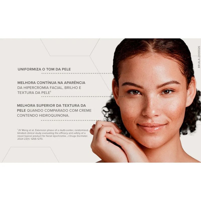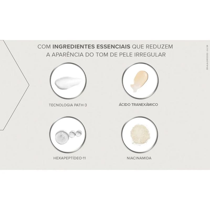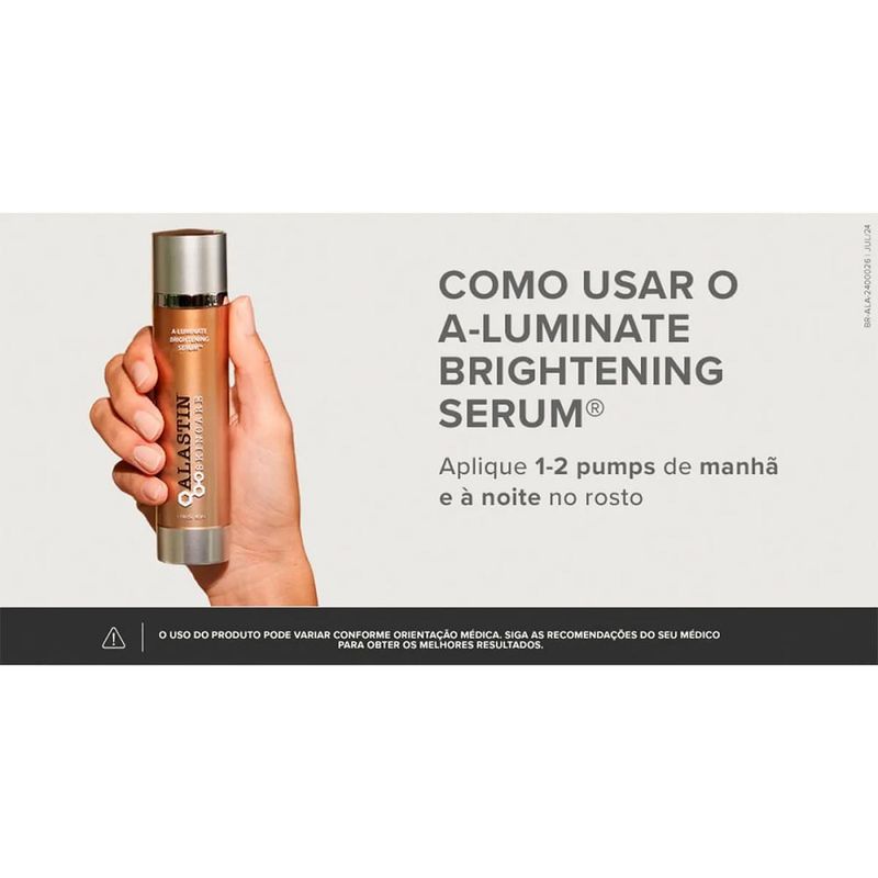O que é e para que serve o Sérum Facial Alastin A-Luminate Brightening? O Sérum Facial Alastin A-Luminate Brightening é um tratamento dermocosmético desenvolvido para quem busca uma pele mais iluminada, uniforme e saudável. Sua fórmula inovadora conta com a exclusiva Tecnologia PATH-3, que atua diretamente na redução de manchas e na prevenção da hiperpigmentação, proporcionando um tom de pele mais homogêneo, radiante e com aspecto rejuvenescido. Este sérum é livre de hidroquinona e retinol, oferecendo uma alternativa eficaz e segura para o cuidado diário da pele. Como usar o Sérum Facial Alastin A-Luminate Brightening? Aplique de 1 a 2 pumps do produto sobre a pele limpa e seca, duas vezes ao dia, pela manhã e à noite. Pela manhã, é indispensável complementar a rotina com um protetor solar de amplo espectro, garantindo máxima proteção contra os danos causados pela radiação UV e potencializando os resultados do tratamento. Principais ativos e seus benefícios Tecnologia PATH-3Desenvolvida para reduzir a reincidência da hiperpigmentação, além de proteger a pele contra danos futuros, mantendo os resultados ao longo do uso. Ácido Tranexâmico EncapsuladoAtivo potente no combate às manchas, atua diretamente na correção da hiperpigmentação, proporcionando uma pele mais uniforme e luminosa. Niacinamida (Vitamina B3)Auxilia na melhora do tom da pele, suavizando áreas escurecidas, fortalecendo a barreira cutânea e promovendo ação antioxidante e anti-inflamatória. Advertências e cuidados Produto de uso externo. Não ingerir. Mantenha fora do alcance de crianças. Não aplicar sobre a pele irritada ou lesionada. Em caso de irritação, suspender o uso e procurar orientação médica. Em caso de contato com os olhos, enxaguar abundantemente com água. Conservar em local fresco, ao abrigo da luz e do calor. Em caso de ingestão acidental, procurar imediatamente um serviço de saúde.