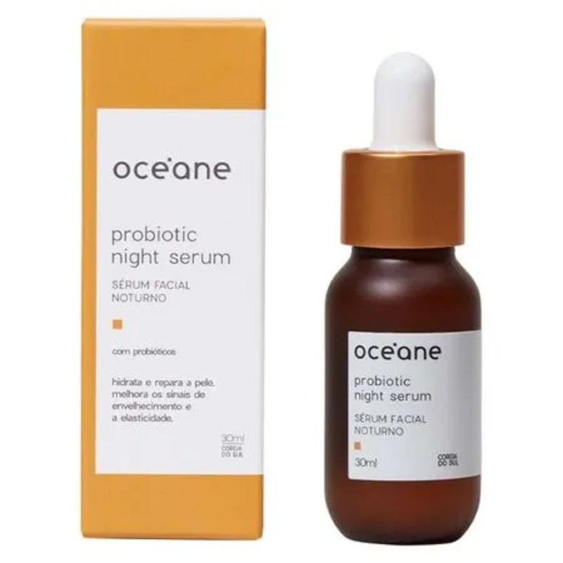 Sérum Facial Noturno Probiotic Night Sérum Océane 30ml Este Sérum facial noturno possui probióticos que fortalecem a barreira de proteção da pele, regulam o pH e previnem dermatites. Sua fórmula cruelty free contém esqualano, pantenol e niacinamida. Quando a barreira da pele está saudável e equilibrada, as células deixam de produzir oleosidade em excesso, ficam mais hidratadas e sofrem menos com os efeitos dos radicais livres. Os probióticos também fortalecem a barreira de proteção contra a poluição, regulam o pH cutâneo, previnem dermatites, vermelhidão e a psoríase, além de serem ideais para tratar a pele sensível, que costuma ser mais seca. Modo de Uso Durante a noite, limpe a pele com um gel de limpeza facial e tonifique. Em seguida, aplique o sérum no rosto com movimentos circulares de baixo para cima e de dentro para fora, até sentir que o produto foi completamente absorvido. Lave o rosto pela manhã. Use diariamente. Todos os tipos de pele.