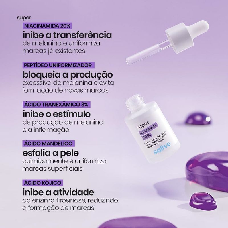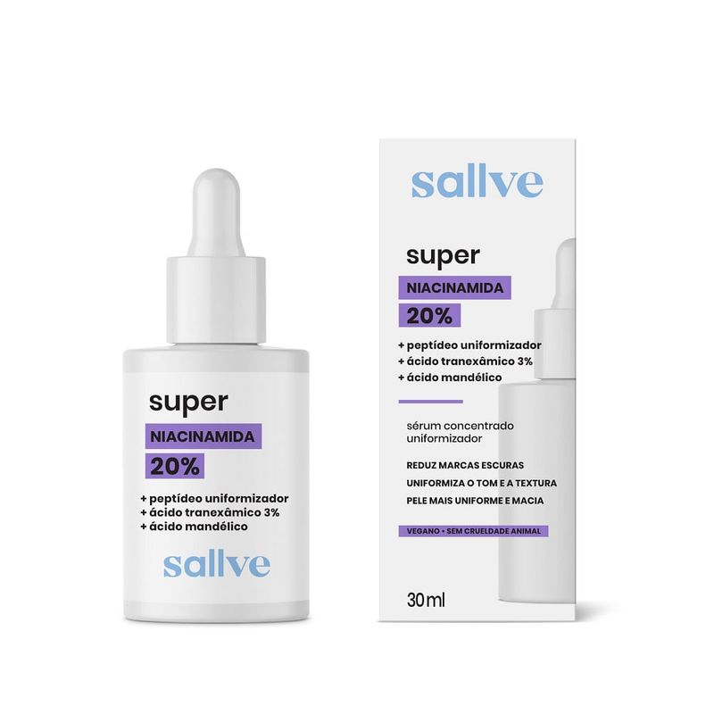 O que é e para que serve? A Super Niacinamida Sallve é perfeita para quem busca uma pele mais uniforme, sem marcas e com um cuidado delicado. Com 20% de Niacinamida, Peptídeo Uniformizador, 3% de Ácido Tranexâmico, Ácido Mandélico e Ácido Kójico, sua fórmula concentrada ajuda a reduzir manchas escuras, uniformiza o tom da pele e previne futuras hiperpigmentações. Além disso, sua ação hidratante e de rápida absorção deixa a pele macia, saudável e com a barreira cutânea reforçada. Ideal para uso diário, de manhã ou à noite, garantindo um tom e textura de pele uniformes. Benefícios e Diferenciais do Produto Diminui o tamanho, intensidade e número de manchas escuras.Previne novas marcas na pele.Uniformiza a tonalidade e a textura.Pele mais suave e saudável.Fortalece a barreira natural da pele. Principais Ativos e Seus Benefícios para a Pele Niacinamida 20%: Ajuda a evitar a transferência de melanina, prevenindo manchas e corrigindo marcas já existentes.Peptídeo Uniformizador: Bloqueia a produção excessiva de melanina e uniformiza a pele.Ácido Tranexâmico 3%: Inibe a plasmina e a tirosinase, prevenindo novas hiperpigmentações.Ácido Mandélico: Promove uma esfoliação suave, reduz a melanina e remove pigmentos da pele.Ácido Kójico: Inibe a ação das enzimas que provocam a produção excessiva de melanina, prevenindo novas marcas. Ingredientes Água, Nicotinamida, Ácido Tranexâmico, Ácido Cítrico, Éter Dicaprílico, Ácido Mandélico, Ácido Kójico, Oligopeptídeo-34, Undecano, Goma de Acácia Senegal, Glicerol, Tridecano, Goma de Falso-Pau-Brasil Hidrolisada, Goma Xantana, Fosfato Tamponado Salino, Poloxâmero 407, Goma de Falso-Pau-Brasil, Gluconato de Sódio, Caprililglicol, Etilhexilglicerina, Tocoferol, Fenoxietanol, Álcool, Sorbato de Potássio, Hidróxido de Sódio, Benzoato de Sódio. Modo de Uso Aplique de 2 a 3 gotas do Sérum Uniformizador no rosto e pescoço, massageando até completa absorção.Use pela manhã ou à noite.Durante o dia, sempre aplique protetor solar após o sérum.Evite combinar com produtos que contenham altas concentrações de ácidos ou ativos esfoliantes.Testes Clínicos e de SegurançaO Sérum Uniformizador passou por rigorosos testes clínicos e foi aprovado pelo Instituto de Pesquisa Clínica, comprovando sua segurança e eficácia. Avaliações de Segurança Dermatologicamente testado: Seguro para aplicação na pele.Oftalmologicamente testado: Seguro para a área dos olhos, exceto nas pálpebras móveis.Não-fototóxico e não-sensibilizante: Não provoca irritação nem sensibilização, mesmo com exposição ao sol.Não-comedogênico: Não obstrui os poros, prevenindo cravos e espinhas. Testes de Eficácia Após 28 dias de uso clínico: Redução de manchas e uniformização da pele: 80% dos participantes observaram redução significativa de manchas, com clareamento de 24%, e 76% apresentaram maior uniformidade do tom em 33%.Função barreira cutânea: Melhora significativa com 17,1% de redução na perda de água transepidérmica.Percepção dos Usuários:Em estudo com 25 participantes, após 28 dias de uso: 92% notaram diminuição das manchas.96% relataram eficácia sem irritação.84% perceberam a pele mais viçosa e radiante.80% observaram diminuição dos poros.76% afirmaram que a pele ficou mais hidratada.92% observaram redução no tamanho das manchas.92% relataram uniformidade no tom da pele.84% notaram melhora na textura da pele.100% elogiaram a rápida absorção e sensação não pegajosa. Advertências Manter fora do alcance de crianças. Uso externo. Evitar o contato com os olhos, e em caso de contato, lavar com água em abundância. Conservar longe da luz e calor. Manter a embalagem fechada após o uso.