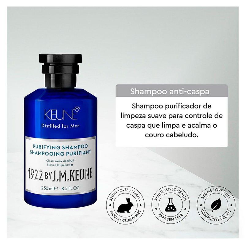 Shampoo Purifying 1922 By J.M. Keune Masculino 250mlShampoo Purifying 1922 By J.M. Keune, é um eficazo couro cabeludo e remove a caspa gradualmente no cabelo do homem. Indicado para combater a caspa e irritação no couro cabeludo masculino.Indicação:Cabelos com caspa seca ou oleosa.Graças à sua fórmula, que contém creatina e piritionato de zinco, fortalece os fios e diminui a proliferação do fungo tipo malassezia, causador da caspa.A creatina faz uma reconstrução que reforça a estrutura interna do fio para diminuir a quebra. Além disso, nutre aqueles cabelos com química. Já o piritionato de zinco atua diretamente na diminuição da proliferação do fungo que causa a caspa.Essa fórmula tão rica do shampoo ainda aumenta a resistência da fibra capilar à quebra e a hidratação dos fios.Modo de Usar:Para um resultado profissional em casa, distribua uma quantidade pequena do produto no couro cabeludo úmido. Massageie suavemente com a palma das mãos e deixe agir por dois minutos. Enxágue em água abundante e repita o processo se necessário.Mas atenção: deve ser usado no máximo duas vezes por semana.