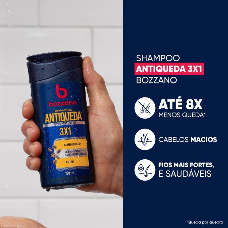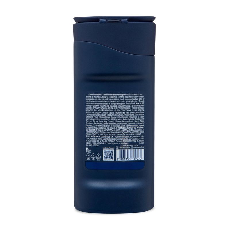Shampoo Bozzano Antiqueda 200ml Fortaleça os fios e combate a queda de cabelo com o Shampoo Bozzano Antiqueda 200ml . Desenvolvido especialmente para fortalecer a estrutura capilar, ele envelhece profundamente na couro cabeludo, revitalizando desde a raiz até as pontas. Com uso contínuo, o shampoo ajuda a reduzir a queda e promove o crescimento saudável dos cabelos, deixando-os mais fortes, encorpados e resistentes. O Shampoo Antiqueda Bozzano é ideal para quem busca uma solução prática e eficaz para queda de cabelo, sem abrir a mão de uma limpeza suave e equilibrada. Sua fórmula é enriquecida com ingredientes que reforçam a fibra capilar e estimulam a couro cabeludo, proporcionando cabelos mais volumosos e com um aspecto saudável. Benefícios do Shampoo Bozzano Antiqueda 200ml: Redução da queda capilar : com uso contínuo, fortalece os fios e ajuda a combater a queda.Revitalização da raiz às pontas : nutre a couro cabeludo e restaura a saúde dos fios.Cabelo mais forte e resistente : promove cabelos mais densos e com aparência saudável.Limpeza equilibrada e sem agressões : limpa a couro cabeludo enquanto fortalece os fios. Como usar o Shampoo Bozzano Antiqueda? Aplique uma quantidade adequada nos cabelos molhados.Massageie suavemente a couro cabeludo com as pontas dos dedos, ativando a circulação e estimulando a ação antiquada.Enxágue bem e, se necessário, repita a aplicação.Para melhores resultados, use regularmente. Perguntas Frequentes: 1. Em quanto tempo começa a ver os resultados na redução da queda de cabelo? Com o uso contínuo, muitos usuários observam fios mais fortes e redução na queda em algumas semanas, especialmente ao combinar com outros cuidados capilares. 2. Posso usar o Shampoo Bozzano Antiqueda todos os dias? Sim, sua fórmula é ideal para o uso diário, proporcionando limpeza suave e fortalecendo os fios a cada lavagem. 3. Esse shampoo é indicado para todos os tipos de cabelo? Sim, o Shampoo Bozzano Antiqueda é adequado para todos os tipos de cabelo e pode ser usado por quem busca fortalecimento capilar e prevenção da queda. 4. O Shampoo Bozzano Antiqueda ajuda no crescimento do cabelo? Sim, ao fortalecer os fios e estimular a couro cabeludo, o shampoo contribui para um crescimento mais saudável, diminuindo a quebra. 5. Devo usar um condicionador junto com o shampoo Antiquebra? Sim, após o shampoo, o uso de um condicionador adequado é recomendado para desembaraçar e hidratar os fios, evitando quebras adicionais.