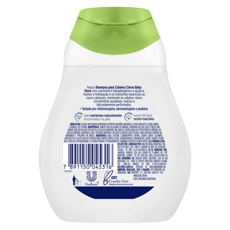 Shampoo Dove Baby Cabelos Claros 200ml• O Shampoo Baby Dove para Cabelos Claros Hidratação Glicerinada hidrata e cuida dos fios claros do bebê, mantendo-os macios e sedosos • Este shampoo para cabelos claros ajuda a manter a hidratação e os nutrientes essenciais ao couro cabeludo, para cabelos visivelmente saudáveis, macios e delicadamente perfumados • O Shampoo Infantil Baby Dove para Cabelos Claros é hipoalergênico e possui pH neutro para a pele do bebê • Shampoo Baby Dove possui fórmula sem lágrimas, corantes, parabenos, ftalatos e sulfatos, e testado por oftalmologista, dermatologista e pediatra • Shampoo com camomila e fragrância suavemente doce e reconfortante • Todos os sabonetes líquidos e shampoos para bebê Baby Dove apoiam a saúde mental materna por meio da parceria com a Postpartum Support International O nosso Shampoo Baby Dove para Cabelos Claros com camomila é hipoalergênico e ajuda a manter a hidratação e os nutrientes essenciais ao couro cabeludo do bebê, mantendo os cabelos claros visivelmente saudáveis, macios e delicadamente perfumados, desde o primeiro banho. Criado com pH neutro para a pele do bebê e nutrientes naturalmente encontrados na pele, esse shampoo infantil cuida do delicado couro cabeludo do seu bebê e deixa com sensação e aparência saudáveis desde seu primeiro uso. Por isso, além de limpar delicadamente, ajuda a hidratar o couro cabeludo e os fios de cabelos, mantendo-os macios e bem cuidados. Aproveite toda a hora do banho com essa cuidadosa fórmula hipoalergênica, suave e sem lágrimas do shampoo para cabelos claros com camomila. Com um perfume delicado e reconfortante desenvolvido especialmente para a pele do bebê, esse shampoo para bebês deixa os cabelos do seu pequeno saudáveis e ajuda a repor a hidratação e nutrientes essenciais com o uso. Modo de uso: Aplique uma pequena quantidade de produto nas mãos, massageie o couro cabeludo e o cabelo úmido e enxágue. Após lavar os cabelos do seu bebê, experimente aplicar o Condicionador para Cabelos Claros Baby Dove após o shampoo, para ajudar a manter os fios dos cabelos macios e fáceis de pentear. Testado por oftalmologista, dermatologista e pediatra.