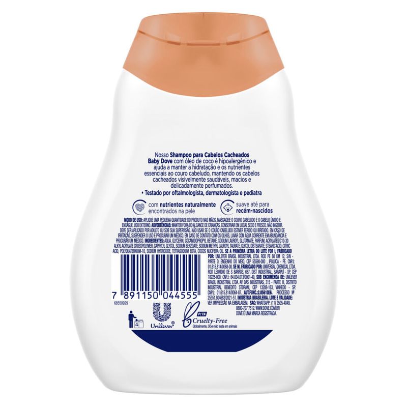 Shampoo Dove Baby Hidratação Enriquecida Cabelo Cacheado 200mlO Shampoo Dove Baby Hidratação Enriquecida Cabelo Cacheado é suave e deixa o couro cabeludo do seu bebê hidratado e visivelmente saudável. Sua fórmula hipoalergênica com pH neutro ajuda a manter os cabelos macios e perfumados. Enriquecido com oléo de coco, o Shampoo Dove Baby Hidratação Enriquecida Cabelo Cacheado auxilia a repor a hidratação e os nutrientes essenciais que o couro cabeludo do bebê que podem ser perdido durante o banho. Testado por oftalmologista, dermatologista e pediatra. Sem lágrimas, corantes, parabenos, ftalatos e sulfatosImagem meramente ilustrativa. A embalagem está sendo atualizada pelo fabricante.