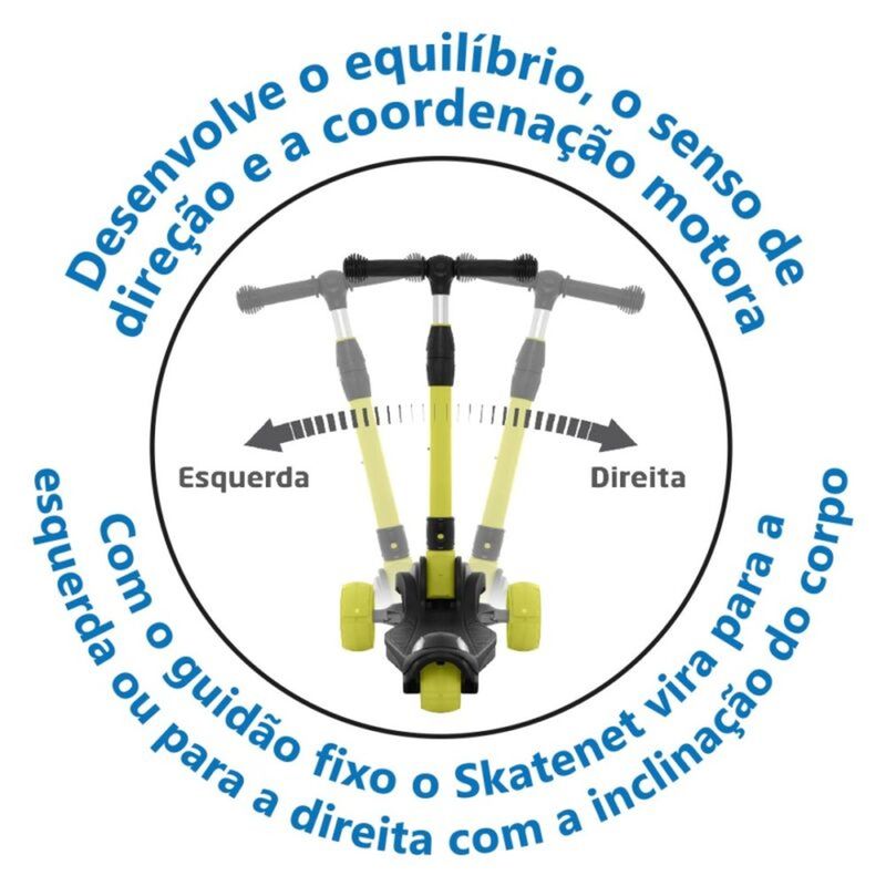 Aviso: Imagens Meramente Ilustrativas! SKATENET LED PRO DOBRÁVEL O Skatenet® LED PRO Dobrável desenvolve o equilíbrio, a coordenação motora e o senso de direção. Seu guidão fixo possui um sistema de inclinação, no qual a criança controla a direção inclinando o corpo levemente para os lados, tornando a movimentação mais fluida e natural. Além disso, seu design dobrável facilita o transporte e o armazenamento. Detalhes do produto - Luzes que acendem com o movimento da roda - Freio traseiro - Guidão com regulagem de altura - Manoplas emborrachadas atóxicas - Guidão fixo que vira para os lados com a inclinação do corpo - Textura na base para maior aderência e segurança - Rolamento de alta performance Ficha Técnica: Marca: Bandeirante Modelo: 1548 Cor: Preto Idade Sugerida: + 24 Meses Peso Suportado: 100 kg Altura Máx Sugerida: 1.19 M Medidas Do Produto (C.L.A): 58 x 14 x 92 Cm Aproximadamente Medidas Da Embalagem (C.L.A): 71 x 18,5 x 33 Aproximadamente
