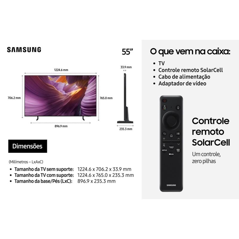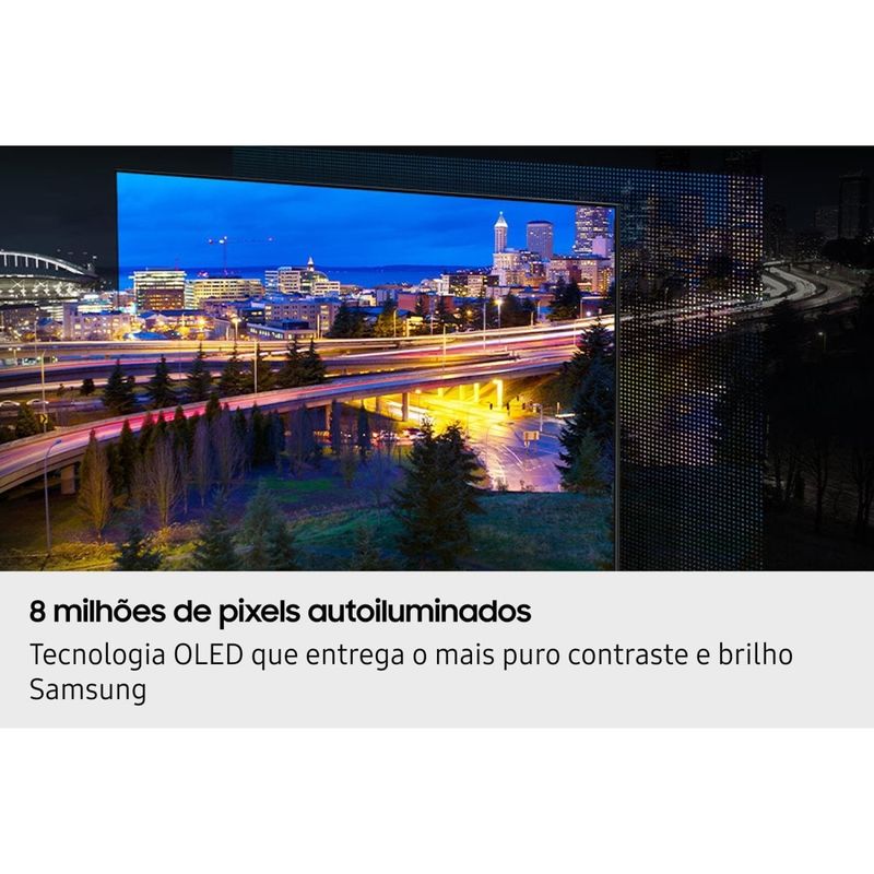 A Smart TV Samsung OLED 55” 4K Vision AI oferece uma experiência de imagem e som premium, com design sofisticado e recursos inteligentes para o máximo em entretenimento.Seu painel OLED com milhões de pixels autoiluminados garante pretos absolutos, cores vibrantes e contraste impecável. O Processador NQ4 AI Gen2 aliado ao Upscaling em 4K com inteligência artificial aprimora cada detalhe, enquanto o Motion Xcelerator 120Hz garante fluidez em filmes, esportes e jogos.Com o inovador Vision AI, você controla a TV por gestos e aproveita ajustes automáticos de imagem conforme o conteúdo. O áudio imersivo com Dolby Atmos e potência de 20W RMS proporciona som nítido e envolvente.O sistema Tizen™ Smart TV garante acesso aos melhores apps de streaming, com 7 anos de atualização. Compatível com Alexa e Bixby, conta com conectividade completa: Wi-Fi 5, Bluetooth 5.3, 4 HDMI, 2 USB, Ethernet, saída óptica e entrada RF. O controle remoto SolarCell dispensa pilhas, carregando com luz ambiente.Tela OLED 55” 4K com HDR10+Processador NQ4 AI Gen2Motion Xcelerator 120HzDolby Atmos 20W RMSControle por gestos Vision AIA Smart TV 55” 4K Samsung QN55S85FAGXZD OLED também entrega comandos de voz à distância e recursos de acessibilidade para deficientes visuais, auditivos e motores.