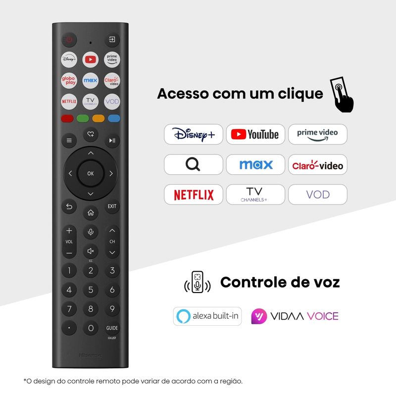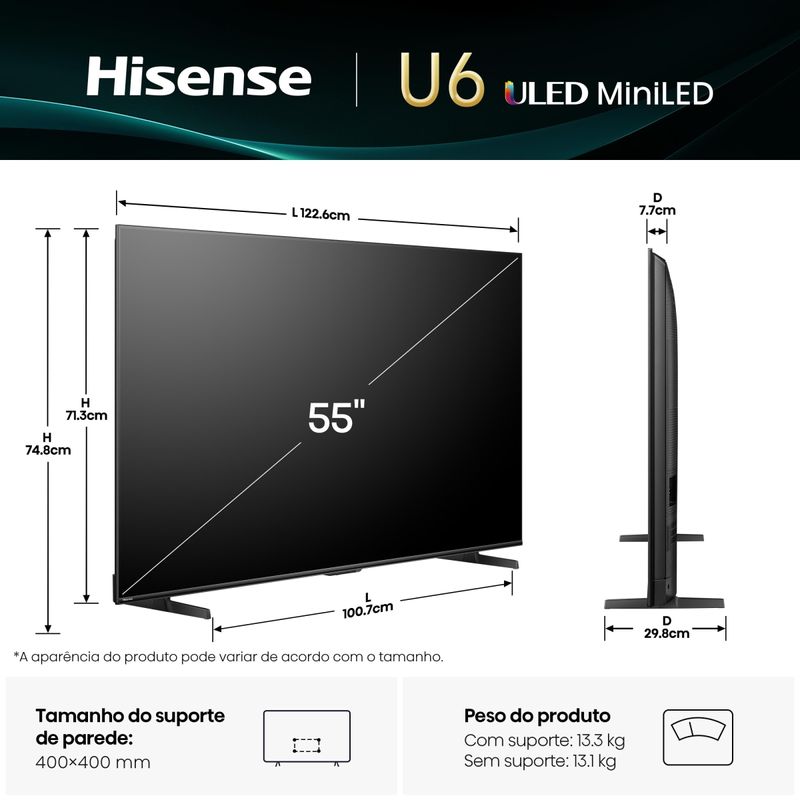 Smart TV 55” 4K UHD Hisense 55U6QV: imagens impressionantes! 4K UHD A Smart TV Hisense 55U6QV entrega imagens com resolução 4K UHD e tecnologia Mini LED, garantindo alto nível de brilho, contraste preciso e maior controle de iluminação. Dolby Vision Equipada com Quantum Dot e suporte completo a Dolby Vision, Dolby Vision IQ, HDR10+, HDR10 e HLG, a TV proporciona cores mais vivas, cenas realistas e excelente definição em qualquer tipo de conteúdo. Sistema Operacional O sistema operacional Vidaa oferece navegação rápida e intuitiva, com Wi-Fi integrado, espelhamento via MiraCast e compatibilidade com Alexa e Google Assistente, facilitando o controle da TV no dia a dia. Dolby Atmos Para o áudio, a Hisense 55U6QV conta com som estéreo de 20W e suporte a Dolby Atmos, entregando uma experiência sonora mais imersiva para filmes, séries e jogos. Com design moderno a Smart TV possui múltiplas conexões, incluindo 4 entradas HDMI e 2 portas USB, além de conversor digital integrado, sendo uma excelente escolha para quem busca tecnologia e desempenho. Tela Mini LED 4K de 55” Potência de Áudio 20W Quantum Dot Compatível com Alexa e Google Home Deixe a sua casa ainda mais conectada, conheça outros produtos com a qualidade e tecnologia Hisense! Comprou a TV e não sabe ou não pode instalar, contrate agora mesmo o nosso Serviço de Instalação TV*. Temos profissionais 100% qualificados para instalação de qualquer aparelho em sua casa. Aproveite agora mesmo! *Serviços de Instalação indisponível para compras realizadas no site Extra.com
