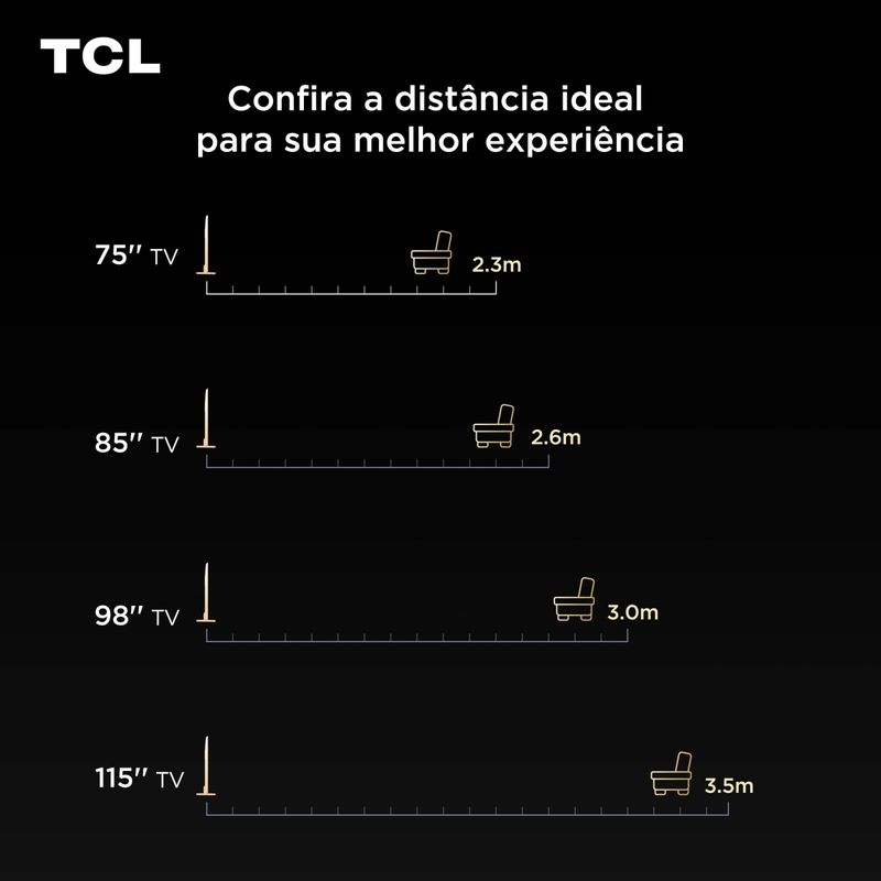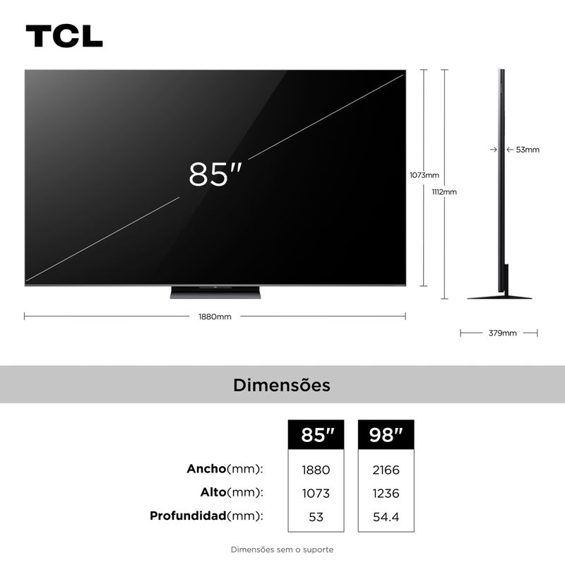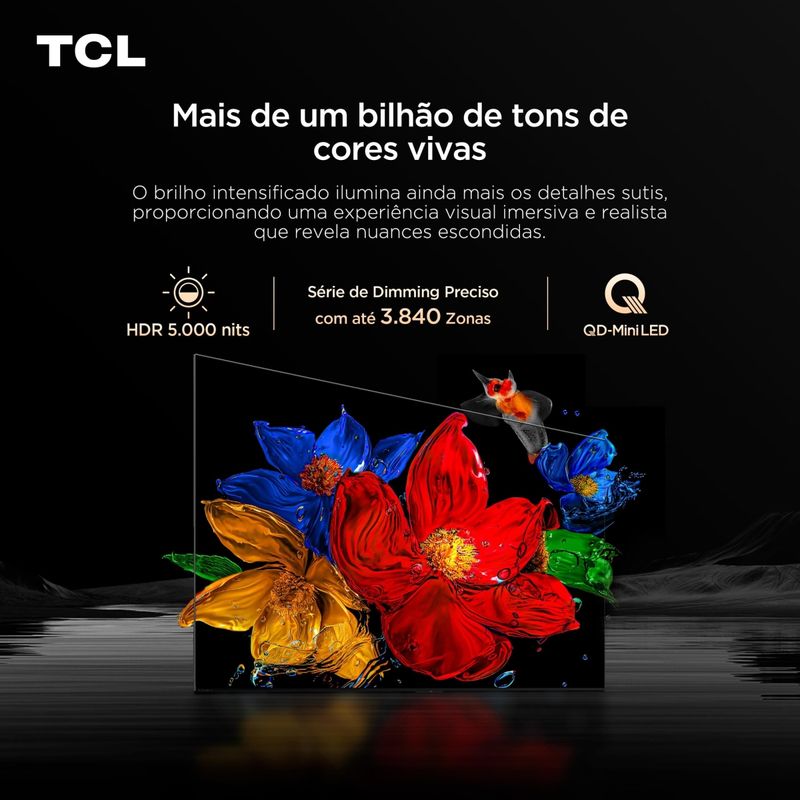 A Smart TV TCL 85” 4K QD-Mini LED 85C8K redefine a experiência de imagem com tecnologia de ponta e performance superior para entretenimento e jogos. Com design sem bordas (Zero Border) , essa TV alia estética e inovação para transformar seu ambiente. Equipada com painel QD-Mini LED, ela entrega cores vivas, contraste elevado com HDR10+ e Dolby Vision IQ, além de taxa de atualização nativa de 144Hz — perfeita para jogos de alta velocidade. Com o recurso 288Hz Game Accelerator, atinge performance superior em jogos FPS e corridas com fluidez incomparável.Seu áudio Bang & Olufsen com Dolby Atmos garante imersão sonora digna de cinema. O processador AIPQ Pro com inteligência artificial realiza ajustes automáticos de clareza, cor, contraste e movimento, otimizando cada cena. Com Google TV, comando de voz à distância e Google Assistente, você acessa seus streamings, configurações e apps de forma rápida. Conta ainda com HDMI 2.1, Bluetooth dual band, Wi-Fi integrado, 2 entradas USB, 4 HDMI, saída óptica, LAN e suporte VESA. Tela QD-Mini LED 85” com resolução 4K Ultra HD (3840 x 2160 pixels) Dolby Vision IQ, HDR10+ e Dolby Atmos 144Hz nativos com Game Accelerator até 288Hz Áudio premium Bang & Olufsen e Google TV integrado Áudio premium Bang & Olufsen e Google TV integrado TCL Channel: Sua Central de Entretenimento Grátis nas Smart TVs TCLAs Smart TVs TCL com Google TV ou Android TV trazem muito mais do que qualidade de imagem — elas oferecem uma experiência completa com o exclusivo aplicativo TCL Channel. Nele, você acessa conteúdos gratuitos, como canais ao vivo, filmes e séries on demand, tudo em uma plataforma intuitiva e integrada ao sistema da TV. O TCL Channel transforma sua sala em um verdadeiro hub de entretenimento, sem complicação e sem custos adicionais.