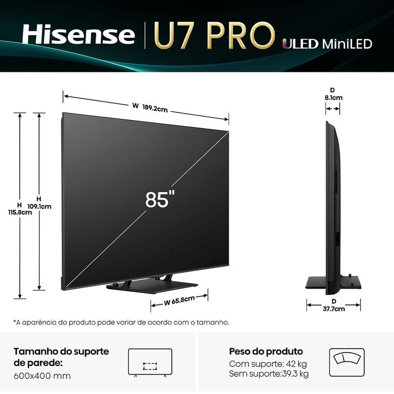 Características VídeoTecnologia: MiniLEDResolução: 4KTamanho da Tela: 85"Sistema Operacional: Android ConexõesWi-Fi 6EBluetooth 5.3 Portas de Entrada e SaídaHDMI2.1*4 (1-eARC)USB*2 (USB3.0, USB2.0)Ethernet*1 (LAN - RJ45)Antena RF*1 ÁudioDolby Atmos Outros RecursosDolby VisionHDR10HDR10+AdaptativeHDR+ GamingHLGDolby Vision IQDolby GamingFilmmaker ModeCompatibilidade Alexa Suportes CompatíveisVESA 600x400 mm EAN7908842867214 CorPreto Especificações TécnicasModelo: 85U7QG PROFrequência: 165 HzGarantia: 12 meses Dimensões e PesoDimensões do Produto sem Embalagem (AxLxP): 1091x1892x81 mmDimensões do Produto com Embalagem (AxLxP): 1290x1090x207 mmPeso do Produto sem Embalagem: 57,3 KgPeso do Produto com Embalagem: 39,3 Kg Itens Inclusos01 Smart TVControle Remoto Serviço de Instalação e Orientação de UsoPara sua comodidade e segurança, a Fast Shop dispõe do serviço de Instalação e Orientação de Uso*. Agendamos o serviço para você, executamos a instalação com equipes próprias especializadas e autorizadas pelo fabricante, ensinamos como utilizar os produtos da melhor forma e temos uma área de qualidade para acompanhar e garantir que tudo dê certo. É rápido e fácil. Você pode contratar o serviço através do nosso canal Blá pelo WhatsApp no número (11) 3232-2949 ou em uma de nossas lojas. Consulte os valores e regiões atendidas. * Verifique com nossos vendedores se a Fast Shop realiza a instalação desse produto.
