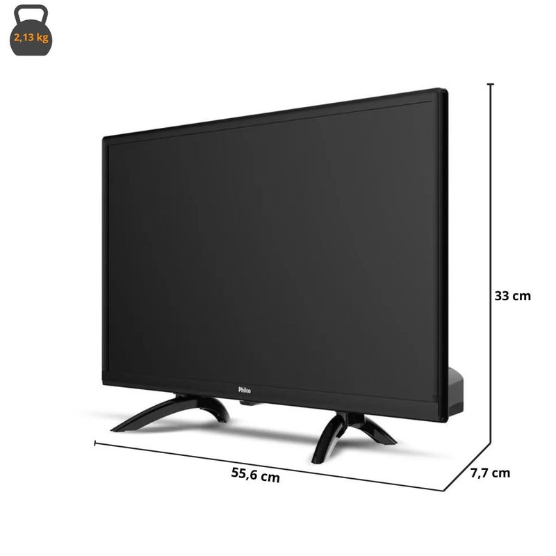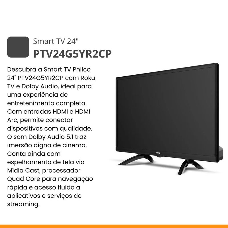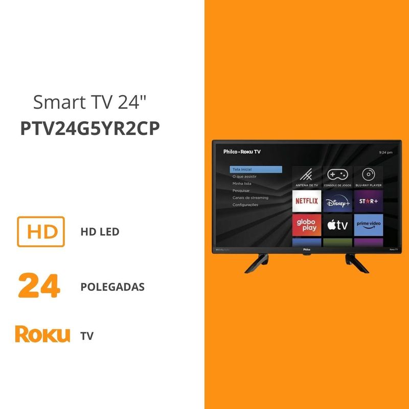 A Smart TV Philco 24” HD PTV24G5YR2CP é a escolha ideal para quem busca praticidade, qualidade e tecnologia em um só produto. Equipada com o sistema Roku TV, oferece uma navegação fluida e acesso rápido aos principais aplicativos como Netflix, YouTube, Prime Video e Disney+. Sua imagem em alta definição e o áudio imersivo com Dolby Audio garantem uma experiência de cinema em casa. Com processador Quad Core, Wi-Fi integrado, espelhamento via Mídia Cast, compatibilidade com Alexa e Google Assistente, além de entradas HDMI, USB e LAN, essa Smart TV é perfeita para transformar qualquer ambiente em um centro de entretenimento moderno e completo.Conteúdos na embalagem:- 01 Smart TV LED 24"- 01 Controle Remoto- 01 Base (Pés)- 01 Manual de InstruçõesAtributos e Benefícios- Tela de 24” com Resolução HD: Ideal para quartos, cozinhas e ambientes compactos, oferece imagens nítidas e cores vivas para uma excelente experiência visual.- Sistema Operacional Roku TV: Interface intuitiva, acesso rápido a aplicativos e compatibilidade com Alexa e Google Assistente, oferecendo controle por voz e navegação simplificada.- Som Envolvente com Dolby Audio: Qualidade sonora superior com sistema 2.0 canais e surround sound, que garante imersão nos conteúdos com áudio mais limpo e potente.- Espelhamento via Mídia Cast: Permite compartilhar fotos, vídeos e conteúdos do celular direto na TV, sem complicações.- Processador Quad Core: Navegação ágil entre os aplicativos e desempenho fluido ao acessar plataformas de streaming e menus do sistema.- Aplicativos Pré-instalados: Acesso imediato a Netflix, YouTube, Prime Video e Disney+, prontos para uso logo ao ligar a TV.- Conectividade Completa: Possui 2 entradas HDMI, 1 USB e porta Ethernet, facilitando a conexão com consoles, notebooks, pen drives e rede cabeada.- Smart TV com Wi-Fi Integrado: Conecte-se facilmente à internet sem precisar de cabos, garantindo maior praticidade no uso diário.- Baixo Consumo de Energia (