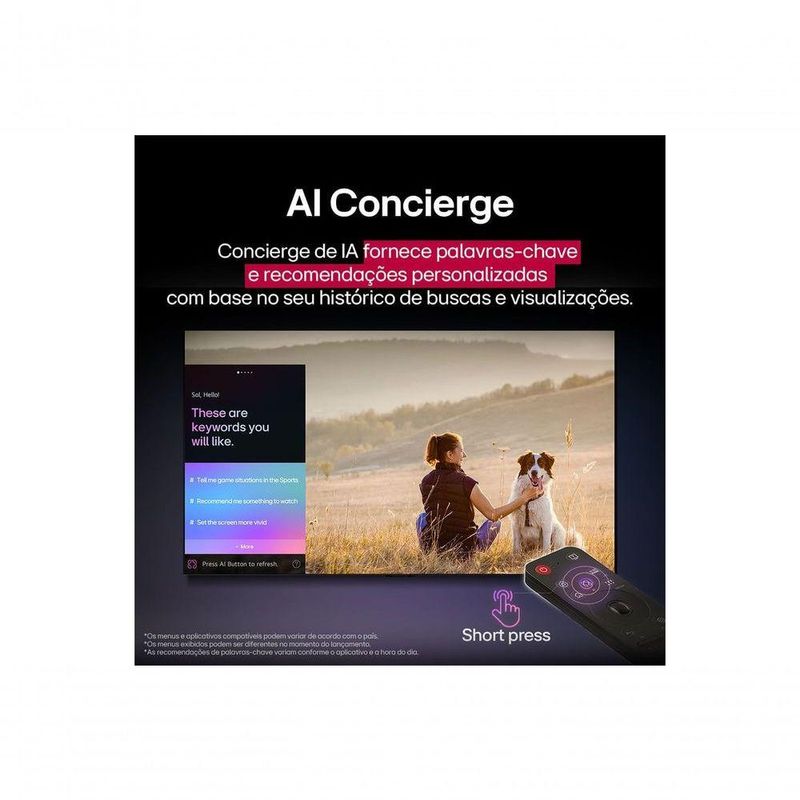 Smart TV LG OLED AI B5 4K de 77 Polegadas 2025Principais recursosQualidade de imagem 4K aprimorada e som surround do Processador com IA Alpha 8 Gen2.Níveis de preto puro em cada pixel para contraste, profundidade e detalhes impressionantes.100% de fidelidade de cores para cores realistas e precisas, e 100% de volume de cor para tons mais ricos.AI Picture Pro que melhora a qualidade visual geral, analisando e aprimorando cada quadro.Controle intuitivo com o AI Magic Remote: novo botão AI, controles de voz e funções de arrastar e soltar.webOS Programa Re:New: Novas atualizações por 5 anos e segurança premiada.Especificações Técnicas:Dimensões sem base (LxAxP): 1719 x 989 x 50,9Dimensões com base (LxAxP): 1719 x 1057 x 319Dimensões da embalagem (LxAxP): 1839 x 1130 x 200Base da TV (LxAxP): 1403 x 319Peso sem base: 22,9Peso com base: 23,5Peso da embalagem: 33,5Suporte Vesa (LxA): 300 x 200Código de Barras: 7893299959776Tipo de Painel: 4K OLEDResolução: 4K Ultra HD (3.840 x 2.160)Frequência Nativa: 120Hz NativoAmpla Gama de Cores: OLED CoresProcessador: a8 AI Processor 4K Gen2Upscaler AI: a8 AI Super Upscaling 4KSeleção de Gênero AI: Sim (SDR/HDR)AI Brightness Control: SimHDR (High Dynamic Range): Dolby Vision / HDR10 / HLGFILMMAKER MODE: SimHFR (High Frame Rate): 4K 120 fps (HDMI)Dynamic Tone Mapping: Sim (Dynamic Tone Mapping Pro)Dimming Technology: Pixel DimmingMotion: OLED MotionModo de Imagem: 10 modosAuto Calibração: SimAI Picture Pro: SimQMS (Quick Media Switching): SimCompatível com G-Sync (Nvidia): SimCompatível com FreeSync (AMD): SimHGIG Mode: SimOtimizador de Jogos: Sim (Painel de Jogos)ALLM (Modo de Baixa Latência Automático): SimVRR (Taxa de Atualização Variável): Sim (Até 120Hz)Tempo de resposta: Menos de 0.1msDolby Vision para Gaming (4K 120Hz): SimSistema Operacional: webOS 25Reconhecimento Inteligente de Voz: SimControle Smart Magic: Built-In (Integrado)App de Controle pelo Smartphone: Sim (LG ThinQ)Web Browser Completo: SimLG Channels: SimMulti View: SimAlways Ready: SimCompatível com Câmera USB: SimCompatível com Apple Home: SimHome Hub: SimAI Chatbot: SimReconhecimento de Voz: SimGoogle Home / Hub: SimCompatível com Apple Airplay: SimGoogle Cast: SimSaída de Áudio: 20WSistema de Som: 2.0 CanaisDireção do Som: InferiorDolby Atmos: SimAI Sound α8 AI: Sound Pro (Som virtual 9.1.2)Clear Voice Pro: Sim (Nivelamento automático de volume)AI Acoustic Tuning: SimWiSA Ready: Sim (Até 2.1 Canais)LG Sound Sync: SimModo audio Compartido: SimSaída de Áudio Simultâneo: SimBluetooth Surround Ready: Sim (2 Way Playback)Audio Codec: AC4, AC3 (Dolby Digital), EAC3, HE-AAC, AAC, MP2, MP3, PCM, WMA, apt-X (vide manual)WOW Orchestra: SimReceptor digital de sinal: ATSC1.0 (terrestre), DVB-T2/T (terrestre),ISDB-T (terrestre)Receptor analógico de sinal: NTSC/PAL-M/PAL-NEntrada HDMI: 4 (suporta 4K 120Hz, eARC, VRR, ALLM e Quick Media Switch)Simplink (HDMI CEC): SimRetorno de Canal de Áudio: eARC (HDMI 3) USB 2ea (v 2.0)Wi-Fi: Sim (Wi-Fi 6)Bluetooth Support: Sim (v 5.3)Ethernet: 1eaEntrada de RF (Antena/Cabo): 1eaSPDIF (Saída de Áudio Digital Óptica): 1eaAlto Contraste: SimEscada de Cinza: SimCores Invertidas: SimVoltagem: AC 100~240V 50-60HzConsumo de energia em stand by: Abaixo de 0,5WControle Remoto: Controle Smart Magic MR25Cabo de Força: Sim (Anexo)Tamanho da Tela: 77Marca: LGVoltagem: 110v/220vModelo: OLED77B5PSAPerguntas Frequentes: Vocês faturam para B2B/CNPJ?Os produtos são vendidos para o consumidor final (CPF/B2C). Não realizamos vendas para Empresas (CNPJ/B2B).Existe uma limitação para quantidade de produtos comprados?Considerando que a venda é realizada para pessoas físicas (CPF/B2C), com o intuito de uso e consumo, o limite de compra é de até 10 (dez) produtos.Os produtos são originais?Sim, nós somos a loja oficial da LG no Brasil. Todos os produtos são originais e com nota fiscal.Vocês enviam nota fiscal?Sim, todos os produtos são enviados com a Nota Fiscal.É possível trocar?Não trabalhamos com o processo de troca do produto, mas é possível devolver a mercadoria, receber o reembolso e comprar novamente o produto desejado, desde que respeitadas as regras e prazos previstos no Código de Defesa do Consumidor.Os produtos tem garantia?Sim, todos os produtos têm garantia da loja oficial da LG no Brasil.Qual o valor do frete?O valor do frete é calculado automaticamente pelo canal de venda. Basta inserir o CEP de entrega no campo abaixo do valor do produto. Se não aparecer valor, o frete estará sem custo no período aproveite!A Web Continental trabalha como um Agente de Vendas da LG. A Nota Fiscal e o envio do produto serão feitos pela LG.