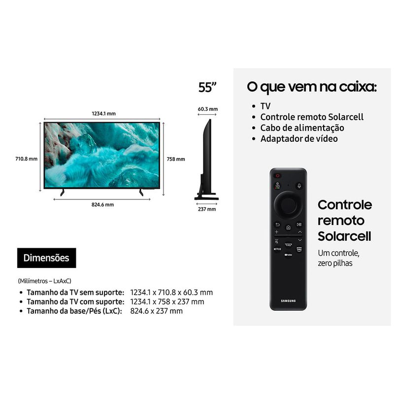 Características VídeoResolução: 4KTamanho da Tela: 55"Smart TV ConexõesBluetoothWi-fi Outros RecursosPontos QuânticosProcessador com AIXbox Cloud GamingControle por GestosArt StoreAlexa integradaEAN7892509141482 CorPreto Especificações TécnicasModelo: QN55Q7FAAGXZDFrequência: 60 HzGarantia: 12 meses Dimensões e PesoDimensões do Produto sem Embalagem (AxLxP): 711 x 1234 x 60 mmDimensões do Produto com Embalagem (AxLxP): 819 x 1370 x 127 mmPeso do Produto sem Embalagem: 10,80 KgPeso do Produto com Embalagem: 15,70 Kg Itens Inclusos01 Smart TV01 Cabo de Força01 Controle Remoto01 Manual do Usuário Serviço de Instalação e Orientação de UsoPara sua comodidade e segurança, a Fast Shop dispõe do serviço de Instalação e Orientação de Uso*. Agendamos o serviço para você, executamos a instalação com equipes próprias especializadas e autorizadas pelo fabricante, ensinamos como utilizar os produtos da melhor forma e temos uma área de qualidade para acompanhar e garantir que tudo dê certo. É rápido e fácil. Você pode contratar o serviço com o nosso canal Blá pelo WhatsApp no número (11) 3232-2949 ou em uma de nossas lojas. Consulte os valores e regiões atendidas.