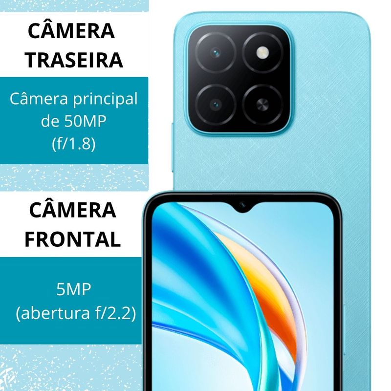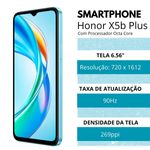 Conteúdo da embalagem1 Smartphone Honor X5b Plus1 Capa de Silicone1 Adaptador AC/DC1 Cabo USB-C1 Pino de ejeção SIM Card1 Manual e termo de garantia1 QR Code para acessos à livros digitaisInformações Tecnicas:SISTEMA OPERACIONAL- Tipo: Android MagicOS 8.0- Versão: MagicOS 8.0 (baseado no Android 14)PROCESSADOR-- CPU: MediaTek Helio G36- Arquitetura da CPU: 4 x Cortex-A53 até 2,2 GHz + 4 x Cortex-A53 até 1,6 GHz- Tipo de processador: Octa Core- Velocidade do processador : Até 2,2GHz- GPU GRÁFICA: IMG GE8320TELA-- Tamanho: 6.56"- Tecnologia: TF TLCD- Taxa de atualização de tela: 90Hz- Resolução: 720 x 1612- Densidade da tela: 269ppi- Recusros da tela: -Brilho máximo = 530 nits. - Gama de cores = 16,7 milhões decores. - Multitoque = Com suporte para até 10 pontos de toque.- Exibição FullView, tela de gota d'água.CÂMERA-- Resolução da câmera frotal: 5MP (abertura f/2.2)- Resolução da câmera traseira: Câmera principal de 50MP (f/1.8). Câmera Auxiliar- Tipo de foco (CÂMERA TRASEIRA) : PDAF- ZOOM: Zoom digital de 10X- Resolução em gravação de vídeos (Câmera Frontal): Suporte para gravação de vídeo 1920x1080 pixels- Resolução em gravação de vídeos (Câmera Traseira): Suporta 1920×1080 pixels- Recusros da Câmera Frontal: Retrato (incluindo modo de beleza e bokeh)- Recusros da Câmera Traseira: Flash LED traseiro único. - Retrato (incluindo modo de beleza e bokeh). -Marca d'água. - Alta resolução.- Reconhecimento Facial: SimMEMÓRIA-- Memória Ram: (GB) 4GB- Expansão Memória Ram Virtual (GB): Até 4GB- Memória Interna (GB): 256GB- Memória Expansível (MicroSD): Sim, suporta expansão de até 1TBREDE / BANDAS- - Número de Sim: Dual Chip- Tipo de Slot de Sim: NanoSIM- Conexões 4G(LTE TDD/LTE FDD). 3G (WCDMA). 2G (GSM)- 2G GSM: B2 / B3 / B5 / B8- 3G WCDMA: B1 / B2 / B4 / B5 / B8- 4G LTE FDD: B1 / B2 / B3 / B4 / B5 / B7 / B8 / B13 / B26 / B28 / B32 / B66- 4G LTE TDD: B38 / B40 / B41- 5G NR: N/ACONECTIVIDADE- Conector de Entrada: USB-C- Localização: Posicionamento baseado em rede. Posicionamento baseado- Conector de Fone de Ouvido: (3.5mm) Sim- Versão de Bluetooth: Bluetooth 5.1- Protocolos WI-FI: 802.11 a/b/g/n/ac- Suporte WI-FI: 2,4GHz e 5GHz- WI-FI DIRECT: Sim- WI-FI DISPLAY: Não- NFC: Não- SUPORTE A OTG: SimSENSORES- Acelerômetro- Proximidade- Sensor de Luz Ambiente- Motor de vibração- Sensor de Impressão Digita- Microfone com Redução de RuídoCARREGAMENTO E BATERIA- Potência Máxima de Carregamento (W): 5V 2A (10W) - Inteligente- Carregamento dem Fio: Não- Removível: Não- Capacidade da Bateria (mAh): 5200mAhÁUDIO E VÍDEO- Não. Alto falante únicoDimensões e Peso:- Dimensões na caixa: (L x A x C): 9,3 x 18,8 x 6,0 cm- Peso: 0,42 kgGarantia: - 1 Ano do fabricanteCódigo ANATEL: 09693-24-15801Ultra bateria de 5200mAh que ultrapassa dias de uso Desfrute do que você mais gosta sem se preocupar com abateria.256GB de armazenamento para tudo o que você precisa, comdesempenho eficienteTenha espaço de sobra para armazenar todos os seus arquivos,fotos e aplicativos sem preocupações, e desfrute de fluidezsuperior com a memória RAM Turbo de 8GB (4+4GB).Capture momentos nítidos e vibrantes com câmera IA de 50MP. Crie memórias incríveis, seja dia ou noite, com qualidadeexcepcional a cada clique.Experiência visual imersiva com uma tela ultra suave de 90Hz, brilho intenso, clareza surpreendente e alívio para seus olhos.- Tudo isso com acesso à livros digitais que somente a HONOR oferece.