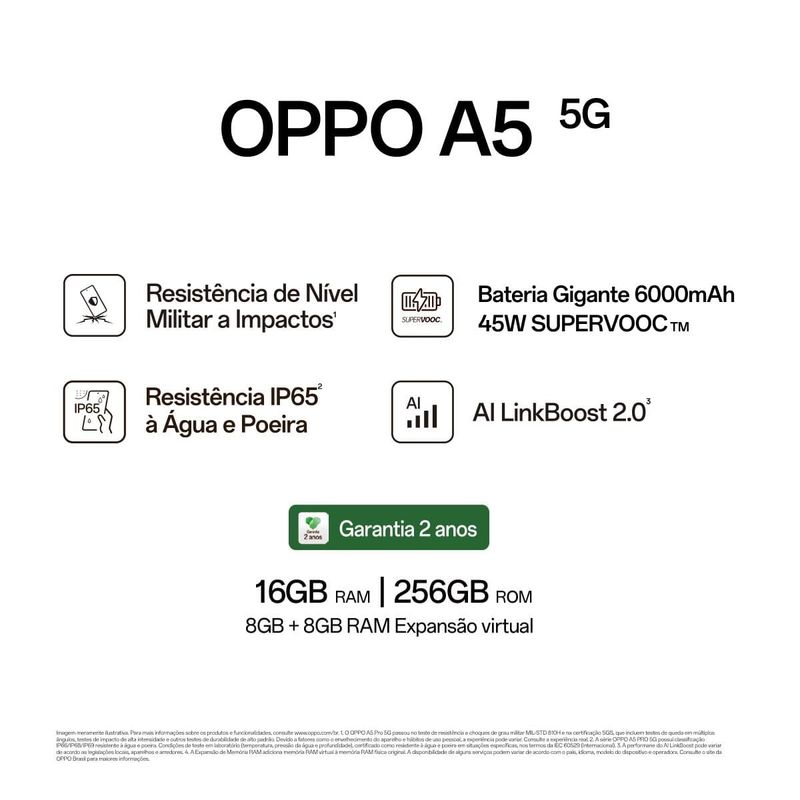 O Smartphone OPPO A5 5G entrega desempenho, autonomia e praticidade no dia a dia. Com design fino, leve e moderno na cor Verde, ele oferece conforto no uso contínuo e visual elegante em qualquer ocasião. Seu processador Mediatek Dimensity 6300 Octa-Core de 2,4GHz aliado à memória RAM de 8GB + 8GB de expansão de memória virtual garante performance fluida para navegar, assistir e se conectar sem travamentos. O armazenamento interno de 256GB oferece espaço de sobra para aplicativos, fotos, vídeos e muito mais. A tela de 6.67” possui tecnologia de ajuste automático torna a experiência ainda mais agradável aos olhos.Capture seus melhores momentos com a câmera traseira dupla de 50MP e 2 MP e a câmera frontal de 8MP. Ambas entregam resultados nítidos para fotos, vídeos e videochamadas. Outro grande diferencial é a bateria de 6000mAh, que permite carregamento rápido de 45W, para quem precisa de rapidez e confiança.Tela de 6,67”Resolução: 1604 x 720 pixelsMediatek Dimensity 6300 Octa-Core de 2,4GHzMemória RAM de 8GB+8GB Expansão Virtual Armazenamento interno de 256GB Sistema Android com interface ColorOS 15Câmera traseira de 50MP e 2MPCâmera frontal de 8MP Dual Chip NanoLeitor de impressão digital lateralSensores: proximidade, acelerômetro, geomagnéticoConectividade: Bluetooth, Wi-Fi, GPSResistência IP65 a Água e PoeiraBateria de 6000mAh com carregamento rápido de até 45WCompleto em conectividade, o OPPO A5 traz Bluetooth, Wi-Fi, GPS e suporte a mensagens SMS, MMS, EMS e e-mail. Os sensores inteligentes incluem proximidade, acelerômetro, impressão digital lateral e indução geomagnética, entregando segurança e praticidade em um só aparelho.