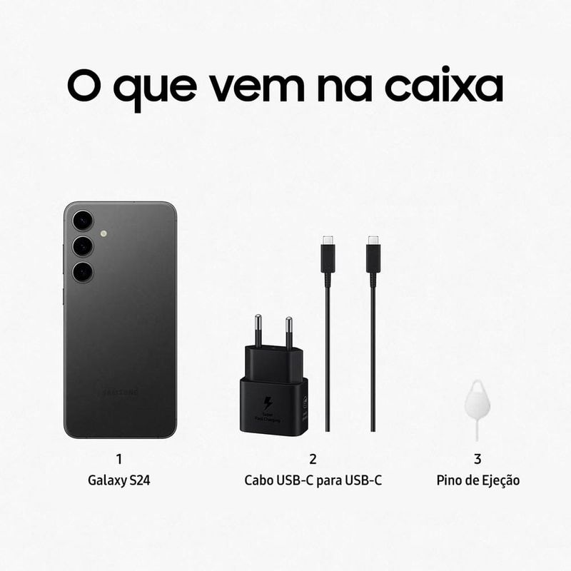 Desvende o Futuro com o Galaxy S24! O Galaxy S24 5G da Samsung foi pensando para você que deseja ter uma experiência única e inovadora. Falando em inovação, o S24 conta com Galaxy AI, um recurso de inteligência artificial para você desfrutar de tudo que há de mais atual em smartphone. A tradução simultânea funciona para chamadas telefônicas convencionais e a tradução de texto funciona para todo app que faz troca de mensagens (WhatsApp, Direct do Instagram, SMS, Telegram etc). Já a função Circule para Pesquisar permite fazer busca de qualquer informação que você tenha na tela do aparelho. A IA da Samsung garante uma experiência personalizada e adaptativa. Desempenho surpreendente Equipado com o processador Exynos 2400 de última geração, o Galaxy S24 proporciona um desempenho excepcionalmente rápido e eficiente. Desfrute de jogos sem interrupções, multitarefa fluida e navegação ultrarrápida, tudo isso impulsionado pela mais avançada tecnologia de processamento. Além do aparelho ser super tecnológico a experiência visual conta com um design incrível, tela infinita de 6.2"e tecnologia Dynamic AMOLED 2X, resolução Full HD, câmera traseira tripla e câmera frontal de 12MP. Não é demais? O Samsung Galaxy S24 é a evolução tecnológica, trazendo o futuro para o presente. Esteja preparado para uma revolução em sua vida cotidiana - experimente o Galaxy S24 e eleve sua jornada a novos patamares. O futuro começa agora!
