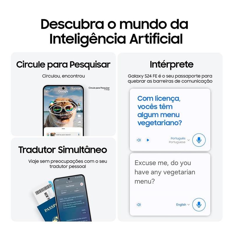Desempenho imbatível e experiência de jogo O Galaxy S24 FE oferece uma performance de alto nível, ideal para quem busca um smartphone potente e eficiente. Equipado com 8GB de RAM e 128GB de memória interna, o dispositivo garante uma navegação fluida e capacidade de armazenar uma grande quantidade de fotos, aplicativos e jogos sem preocupações. Com o processador Samsung Exynos 2400e (Deca-Core) de última geração, o S24 FE proporciona gráficos suaves e alta performance, garantindo uma experiência de jogos imersiva e de alta qualidade por mais tempo. Esse conjunto de recursos torna o aparelho perfeito para quem não abre mão de desempenho e rapidez em todas as suas tarefas. Design robusto e elegante Além de seu desempenho impressionante, o celular Galaxy S24 FE Azul é construído para resistir ao desgaste do dia a dia, com um design durável que transmite sofisticação. Seu acabamento em alumínio reforçado e vidro Corning Gorilla Victus oferece proteção extra contra quedas e arranhões. O modelo é resistente à água e poeira com a certificação IP68, permitindo que você o leve para qualquer ambiente sem preocupação. Câmeras avançadas com Galaxy AI O S24 FE 128GB se destaca por sua câmera tripla de 50MP, que garante fotos nítidas e vídeos de alta qualidade, mesmo em condições de baixa luminosidade. A câmera frontal de 10MP também oferece excelentes selfies e chamadas de vídeo. Graças ao Galaxy AI, o dispositivo permite edições de fotos de forma fácil e intuitiva, proporcionando resultados profissionais sem complicação. Além disso, o recurso de tradução simultânea e assistência rápida via inteligência artificial transforma o S24 FE em um aliado perfeito para quem viaja ou precisa de comunicação fluida em diferentes idiomas. Tela imersiva e bateria duradoura Com uma tela Dynamic AMOLED FHD+ de 6,7 polegadas, o Galaxy S24 FE oferece uma experiência visual impressionante. Com 1900 nits de brilho e cores vibrantes, a tela garante uma visualização nítida e imersiva, seja para assistir vídeos, jogar ou navegar. A taxa de atualização de 120Hz proporciona fluidez e agilidade na interação com o aparelho. A bateria de 4700mAh, por sua vez, oferece uma longa duração, permitindo que você aproveite todos os recursos do smartphone por muito mais tempo. Seja para entretenimento ou produtividade, o S24 FE tem energia de sobra para acompanhá-lo ao longo do dia.