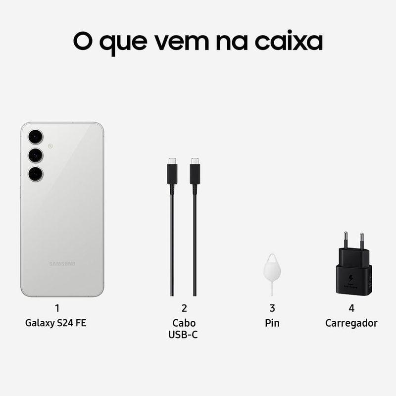 Desempenho poderoso para todas as suas necessidades O Galaxy S24 FE é a escolha perfeita para quem busca inovação, desempenho e durabilidade. Equipado com o processador Samsung Exynos 2400e (Deca-Core), ele oferece uma experiência ágil e eficiente, ideal para jogos, multitarefas e navegação fluida. Com 128GB de armazenamento interno, você tem espaço de sobra para armazenar fotos, vídeos e aplicativos sem preocupações. Design premium e resistência incomparável Construído para durar, o celular Galaxy possui acabamento em alumínio reforçado e vidro Corning Gorilla Victus, proporcionando sofisticação e resistência. Além disso, sua certificação IP68 assegura proteção contra água e poeira, permitindo que você o utilize em qualquer ambiente com mais tranquilidade. Câmeras avançadas com inteligência artificial Registre momentos inesquecíveis com a câmera traseira tripla de 50MP e a câmera frontal de 10MP, garantindo fotos e vídeos de alta qualidade mesmo em baixa luminosidade. A tecnologia Galaxy AI melhora automaticamente suas imagens, oferecendo recursos inteligentes de edição e aprimoramento. Funções inovadoras como tradução simultânea e assistente de pesquisa tornam sua experiência ainda mais completa. Tela imersiva e bateria para o dia todo A tela Dynamic AMOLED FHD+ de 6.7” proporciona cores vibrantes, alta nitidez e brilho de até 1900 nits, garantindo excelente visibilidade em qualquer ambiente. A taxa de atualização de 120Hz proporciona uma navegação fluida e responsiva. Com a bateria de 4700mAh, você aproveita seu smartphone por horas sem precisar se preocupar com recargas frequentes. Segurança reforçada e atualizações garantidas O celular S24 oferece 7 anos de atualizações do sistema Android e de segurança, garantindo proteção contínua para seus dados. A tecnologia Samsung Knox protege suas informações contra ameaças digitais, enquanto o recurso Cadeado Galaxy adiciona uma camada extra de segurança para seus aplicativos e arquivos pessoais. Além disso, o Smart Switch facilita a migração de dados do seu antigo dispositivo para o novo Galaxy S24 FE, tornando a transição rápida e descomplicada.