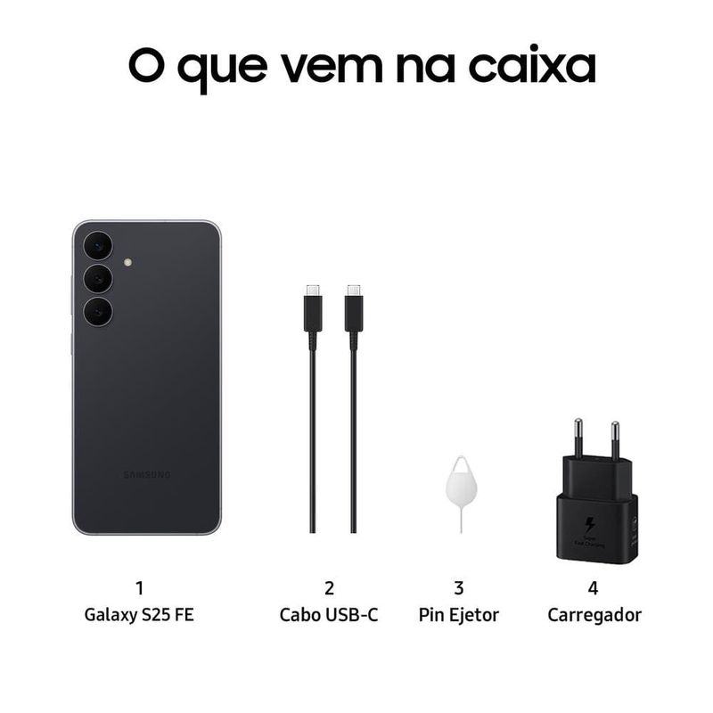 Smartphone Samsung Galaxy S25 FE 5G – Desempenho e design premium com excelente custo-benefício! O Smartphone Samsung Galaxy S25 FE 5G JetBlack une desempenho avançado, inteligência artificial e design premium em um só aparelho. Com apenas 7,4 mm de espessura e 190 g, ele é leve, fino e sofisticado, oferecendo conforto no uso diário entregando o máximo de desempenho. Tela 6,7” A tela Dynamic AMOLED 6,7” FHD+ com até 120Hz e brilho máximo de 1900 nits oferece imagens nítidas e imersivas em qualquer situação. O acabamento em Gorilla Glass Victus+ aliado à proteção IP68 contra água e poeira garantem resistência e durabilidade. Processador Sinta toda a potência do processador Exynos 2400 Deca-Core 4nm, que garante performance estável para jogos, vídeos e multitarefas. Android 16Sistema Operacional Android 16.0 com One UI 8.0, com até 7 versões de atualizações do Android.ArmazenamentoArmazenamento interno de 128GB e memória RAM de 8GB. CâmerasPossui sistema de Câmeras Triplas Traseira 50MP (Wide) + 12MP (Ultra Wide) + 8MP (Tele) com ProVisual Engine.Câmera frontal de 12MP com HDR proporcionam fotos e vídeos com qualidade profissional, mesmo em baixa luminosidade. Aproveite retratos, selfies e edições de vídeo com suporte de IA integrada. Galaxy AIO Galaxy AI com Google Gemini traz recursos de inteligência artificial para facilitar sua rotina, com integração nativa a aplicativos do Galaxy, Google e terceiros. O Samsung Knox protege seus dados pessoais com segurança avançada.Suporta eSIMCom eSIM integrado, o Galaxy S25 FE dispensa o uso do chip físico e permite ativar planos de celular de forma 100% digital. Além de praticidade e flexibilidade para alternar entre operadoras, o eSIM oferece mais segurança — já que não pode ser removido em casos de perda ou roubo — e garante maior estabilidade de conexão. BateriaAlém de performance e design, o Galaxy S25 FE conta com bateria de 4.900mAh, atualizações garantidas de até 7 anos de segurança, garantindo longevidade e confiabilidade para o seu aparelho. Tela Dynamic AMOLED 6,7” 120HzCâmera Traseira Tripla até 50MP com IAResistência IP68 + Gorilla Glass7 anos de atualizações AndroidDescubra mais produtos incríveis com a tecnologia Samsung!