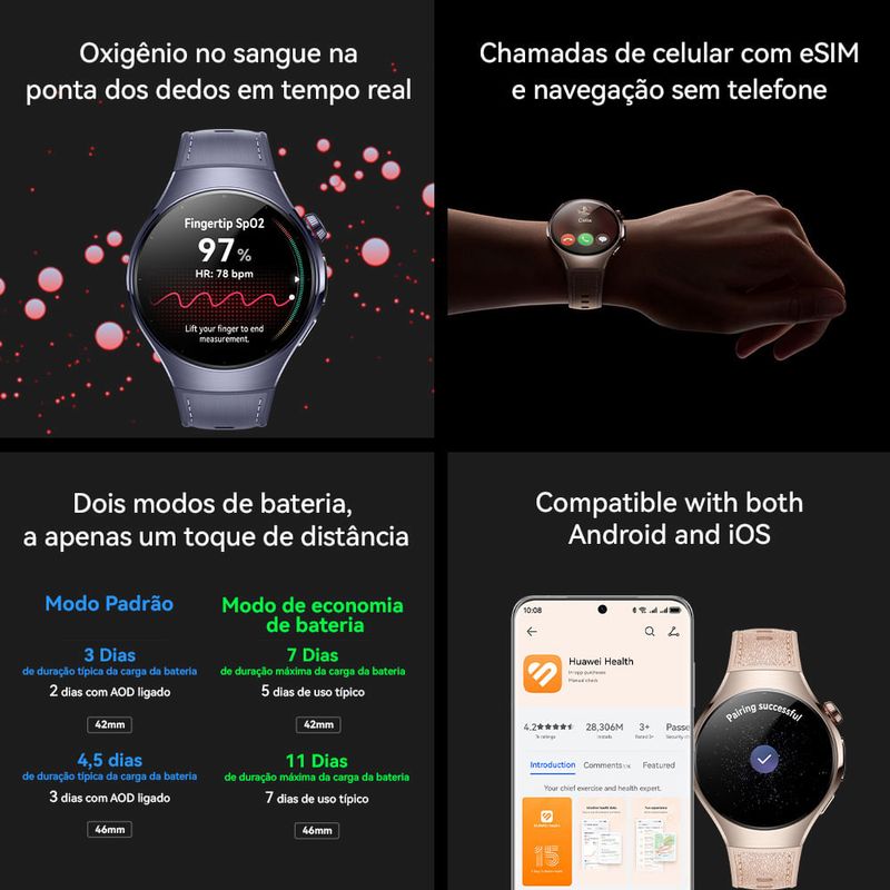 Características Sistema OperacionalHarmony OS TelaTamanho da Tela: 46mmResolução: AMOLEDMaterial da Tela: Vidro safira ConectividadeBluetooth Capacidade32GB * * Parte da memória interna já é utilizada pelo sistema operacional e aplicativos pré-instalados Memória RAM2GB CaixaMaterial da Caixa: Titânio de nível aeroespacial Cor da Caixa: Roxo PulseiraMaterial da Pulseira: CompósitoCor da Pulseira: Roxo BateriaDuração da Bateria: Até 11 diasModos de Bateria Outros RecursosTecnologia X-TAP MultissensorialChamadas de Celular com eSIMOxigênio no Sangue na Ponta dos Dedos CompatibilidadeiOS e Android EAN6942103154669 Especificações TécnicasModelo: 14278Garantia: 12 meses Dimensões e PesoDimensões do produto sem embalagem (AxLxP): 46x46,7x11,3 mmDimensões do produto com embalagem (AxLxP): 120x120x65,0 mmPeso do produto sem embalagem: 0,34 KgPeso do produto com embalagem: 0,58 Kg Itens Inclusos01 Relógio