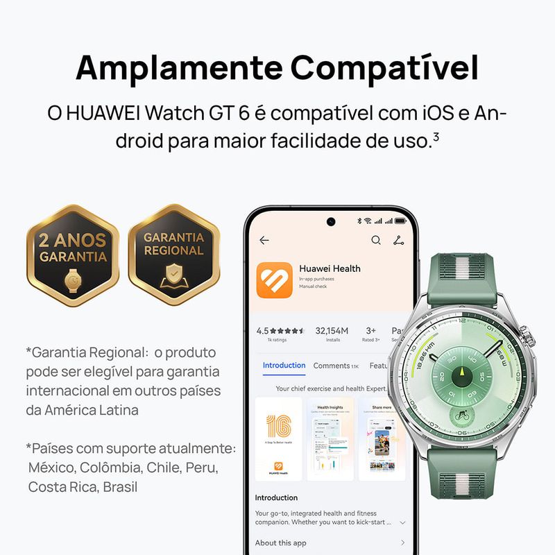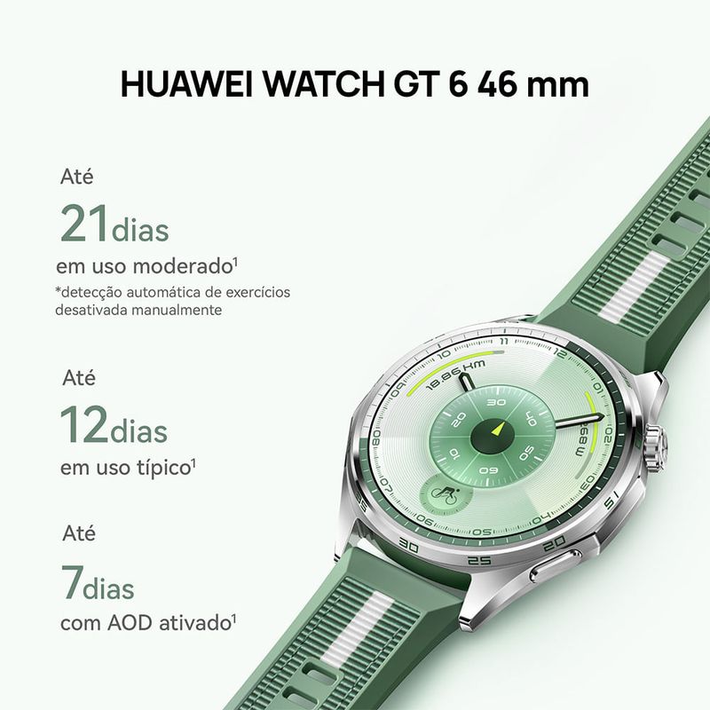 Descubra o Smartwatch Huawei GT6 de 46mm na cor Preta, um dispositivo que combina tecnologia avançada e design elegante. Com recursos planejados para facilitar seu dia a dia, este smartwatch é ideal para monitorar sua saúde, atividades físicas e manter-se conectado de maneira prática e estilosa. Ele é perfeito para aqueles que buscam não apenas um relógio, mas um verdadeiro assistente pessoal no pulso, promovendo um equilíbrio entre vida e desempenho. Destaques Automação e Monitoramento de Saúde Equipado com diversos sensores, o Huawei GT6 monitora sua frequência cardíaca, tempo de sono e até a temperatura do corpo, garantindo que você permaneça consciente da sua saúde durante o dia. Conexão e Conectividade Com conectividade NFC e Bluetooth, você pode receber notificações diretamente em seu pulso, mantendo-se informado enquanto se movimenta. Resistência à Água e Poeira Com classificação 5 ATM e IP69, o relógio pode ser utilizado em atividades aquáticas e oferece proteção contra poeira, permitindo que você aproveite ao máximo suas aventuras no exterior. Características Sistema Operacional Harmony OS Tela Tamanho: Tela colorida AMOLED de 1,47 polegadas (46 mm) Resolução: 466 × 466 pixels, PPI 317" Conectividade NFC: Suportado Bluetooth: 2,4 GHz, suporta BT6,0 e BR+BLE GNSS L1:GPS + GLONASS + GALILEO + BDS + QZSS L5:GPS + GALILEO + BDS +QZSS" Capacidade Armazenamento: 64 GB * Parte da memória interna já é utilizada pelo sistema operacional e aplicativos pré-instalados Processador Huawei Memória RAM 64 MB Caixa Material da Caixa: Aço inoxidável Cor da Caixa: Prata Pulseira Estilo da Pulseira: Casual Material da Pulseira: Fluoroelastômero Cor da Pulseira: Preto Tamanho da Pulseira: Ajustável para pulsos de 140 a 210 mm Bateria Tipo de Bateria: Recarregável Li-ion Duração da Bateria: até 21 dias no máximo (até 12 dias em condições de uso normal, ou até 7 dias com AOD ativado, e até 40 horas no modo de esportes ao ar livre) Carregamento: Carregamento sem fio Requisitos de Tensão e Corrente do Carregador: 5V-10V DC/2A MAX Outros Recursos Resistente à Água: 5 ATM Resistente à Poeira Alto-Falante Microfone Botão Home (Coroa Giratória) e Botão Lateral Sensor acelerômetro Sensor giroscópio Sensor magnetômetro Sensor óptico de frequência cardíaca Sensor barômetro Sensor de temperatura Sensor de luz ambiente Requisitos do Sistema Android 9.0 ou posterior iOS 13.0 ou posterior Especificações Técnicas Modelo: Atum-B19F Garantia: 24 meses EAN: 6942103168710 Dimensões e Peso Dimensões do produto sem embalagem (AxLxP): 46×46×10,95 mm Dimensões do produto com embalagem (AxLxP): 120×120×65 mm Peso do produto sem embalagem: 0,07 kg Peso do produto com embalagem: 0,32 kg Itens Inclusos 01 Smartwatch Huawei GT6 01 Base de Carregamento (incluindo cabo) 01 Guia de Início Rápido 01 Cartão de Garantia