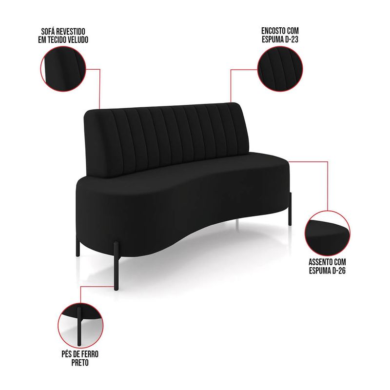 O Sofá 2 lugares Maraú de 160 cm combina funcionalidade, conforto e durabilidade. Com design sofisticado, revestido em tecido veludo preto, é ideal para ambientes como sala de estar, escritório, salão de beleza, recepção, estúdio fotográfico ou em qualquer outro espaço que você queira decorar com estilo e bom gosto. Sua estrutura em madeira de eucalipto tratada e chapas conificadas oferece resistência e sustentabilidade. Ele suporta até 120 kg de peso, podendo ser utilizado por pessoas de diferentes biotipos. O assento tem espuma D-26 e percintas elásticas, enquanto o encosto fixo possui espuma D-23. Os pés são de ferro preto além de garantirem um estilo industrial à peça proporcionam um suporte confortável para o corpo, permitindo que você relaxe após um longo dia. Ele contém curvas arredondadas e detalhes gomados na costura do encosto garantindo aconchego ideal. O Sofá Maraú além de ser leve e fácil de transportar ele irá trazer um charme e qualidade para sua decoração. Aproveite essa oferta e garanta o seu agora mesmo! Dimensões do Produto: Altura Total: 85 cm Largura Total: 160 cm Profundidade Total: 78 cm Tamanho dos pés: 15 cm Peso: 30 kg Outras Medidas: Altura do Encosto: 40 cm Altura do Assento ao Chão: 45 cm Especificações do Produto: Estrutura: Madeira Eucalipto Reflorestada, MDF Espuma do Encosto: D-23 Percintas Elásticas Espuma do Assento: D-26 Percintas Elásticas Revestimento: Veludo Possui Pés: Sim Tipo de Pés: Pé de Ferro Preto Peso Suportado: Até 120 Kg Quantidade de Assentos: Assento Único Quantidade de Lugares: 2 Lugares Tipo de Encosto: Fixo Tipo de Assento: Fixo É retrátil: Não É reclinável: Não Complexidade da Montagem: Baixo Diferenciais: Design Moderno; Costura Matelasse no Encosto Montagem: Produto vai montado, apenas parafusar os pés Garantia: 90 dias contra defeito de fabricação Instruções de Limpeza: Utilizar um pano limpo e levemente úmido Você irá Receber: 01 Sofá Living Entregue em: 01 Volume