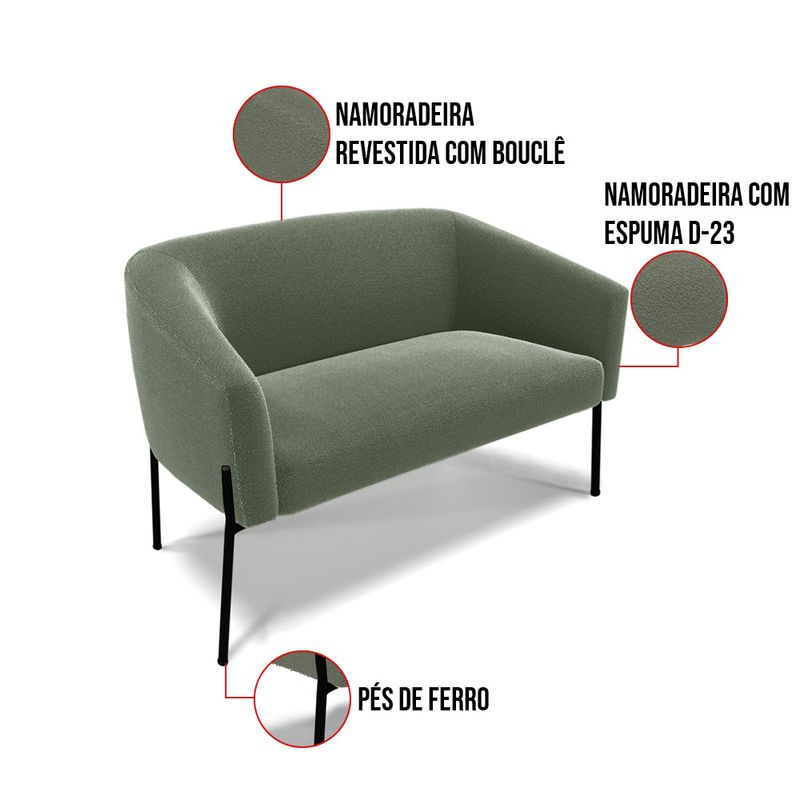 Tem novidades chegando por aqui! Olha só essa nossa inédita Namoradeira Stella Bouclê. Sim, as melhores opções em Namoradeira estão aqui! A Namoradeira Stella Bouclê é para todas as ocasiões, é ideal para você relaxar, assistir tv ou ler um livro, mantendo-o confortável ao longo do dia! Um estofado versátil, que foge do convencional pelo seu design e tecido luxuoso. Seu formato curvo, marcante e sofisticado, oferece conforto de forma excepcional, com aquela sensação de abraço, que deixa o coração quentinho! Desenvolvida com atenção aos detalhes, para atender todas suas expectativas e necessidades. Seu aspecto arredondado e anatômico, possibilita que a postura fique sempre alinhada, mantendo a coluna na posição correta. Ela dispõe de um acabamento impecável, revestida em Bouclê em tom Verde Pistache, um tecido maleável que além de ser muito bonito, é a grande tendência do momento, por ser uma lã mais refinada, quente, com toque suave e agradável, semelhante à textura natural da ovelha. Contém uma estrutura robusta, sua sustentação é dada pelos Pés de Ferro no tom Preto, que garantem mais segurança e firmeza ao sentar-se. Já o enchimento é feito em espuma D-23 no encosto e assento, garantindo maior conforto ao usuário. Ah! Vale a pena lembrar que a Namoradeira Stella Bouclê, foi produzida em quantidades limitadas, para aqueles que procuram criar um visual diferenciado e exclusivo. Então, não deixe de aproveitar esse lançamento, hem! Leve a sua agora mesmo. Dimensões do Produto: Altura Total: 81 cm Largura Total: 127 cm Profundidade Total: 60 cm Altura do Encosto: 40 cm Largura do Assento: 95 cm Profundidade do Assento: 45 cm Altura do chão ao Assento: 45 cm Espessura do Assento: 15 cm Espessura do braço: 7 cm Altura do chão ao braço: 70 cm Altura interna do braço: 28 cm Tamanho dos pés: 30 cm Peso: 25 kg Especificações do Produto: Estrutura: Madeira Eucalipto Espuma: D-23 Tecido: Bouclê Peso Suportado: Até 180 Kg Tipo de Pés: Pés de Ferro Lateral Preto Tipo de Encosto: Fixo Tipo de Assento: Fixo Complexidade da Montagem: Baixo Montagem: O produto vai montado, apenas parafusar a base Garantia: 90 dias contra defeito de fabricação Instruções de Limpeza: Utilizar um pano limpo e levemente úmido Você irá Receber: 01 Sofá Namoradeira - Entregue em: 01 Volume