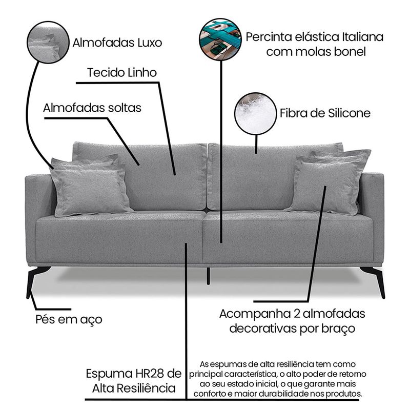O Sofá 2 Lugares Rafaela é uma mobília que combina elegância, conforto e durabilidade. Ele tem um design moderno e sofisticado, com pés em aço carbono, e revestimento em tecido Linho Cinza, que harmonizam com qualquer ambiente. Ele é ideal para sala de estar, recepções ou qualquer outro espaço que você queira decorar com estilo e bom gosto. Ele tem uma estrutura em madeira de reflorestamento eucalipto, que garante a resistência e a sustentabilidade do produto. Com medidas de 160 cm ele suporta até 120 Kg de peso, podendo ser utilizado por pessoas de diferentes biotipos. Ele tem um acabamento reforçado com espuma de qualidade no encosto D23 e plumante em silicone, que oferece maciez e aconchego. Acompanha Almofadas soltas em fibra de silicone. Ele tem assento Fixo com inúmeras elásticas italiana, molas bonnel e espuma HR 28 e plumante em silicone, que proporcionam flexibilidade e conforto. Tem pés em aço carbono, alt.18 cm, cor preto, que protegem o produto contra corrosão e desgaste. O sofá Rafaela é um produto de alta qualidade, beleza e funcionalidade. Ele é fácil de transportar, pois tem um peso leve e um tamanho compacto. O sofá Rafaela é um produto que vai fazer a diferença na sua decoração e no seu bem-estar. Ela vai trazer charme, conforto e durabilidade para o seu ambiente. Aproveite essa oferta e leve para casa um sofá de qualidade por um preço incrível. Essa é a sua chance de ter um sofá maravilhoso por um preço imperdível. Corra e garanta o seu antes que acabe o estoque. Dimensões do Sofá: Altura total: 92 cm Largura total: 160 cm Profundidade total: 92 cm Peso: 43 kg Altura do Braço: 71 cm Altura do chão ao Assento: 46 cm Altura do Encosto: 46 cm Profundidade do Assento: 54 cm Largura do Braço: 8 cm Altura dos pés: 18 cm Especificações do Produto Estrutura: Madeira Eucalipto Reflorestada Densidade da Espuma: HR28 Tipo de Encosto: Almofadas soltas em fibra de silicone Almofada do Encosto: Removível Tipo de Acabamento: Costura Italiana Tipo de Assento: Fixo com percintas elásticas italiana, molas bonel e espuma HR28 + plumante em silicone Quantidade de Lugares: 2 Lugares Tecido: Linho Diferenciais: Acompanha 2 almofadas decorativas por braço Tipo de pés: Aço carbono, alt.18 cm, cor preto Peso suportado: Até 120 Kg Garantia: 90 dias contra defeito de fabricação Montagem: O produto é enviado montado, sendo necessário somente fixar os pés Instruções de limpeza: Utilizar um pano limpo e levemente úmido Você irá receber: 01 Sofá Entregue em: 01 Volume