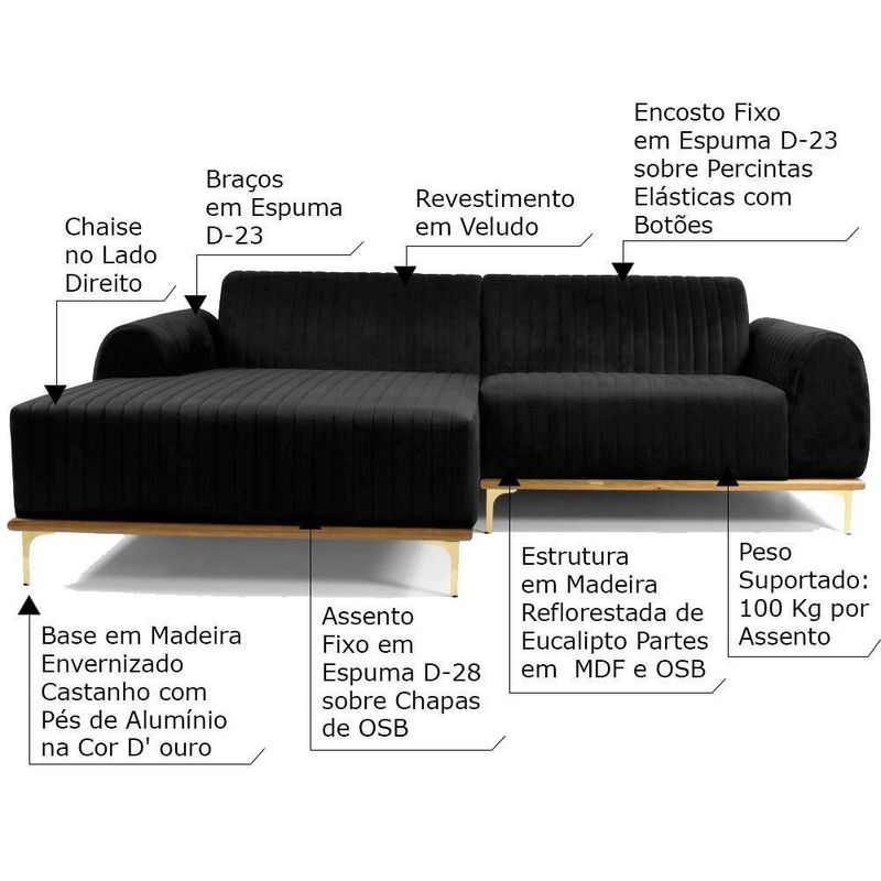 Sofá 3 Lugares com Chaise Base de Madeira Euro 245 Cm Veludo Preto Gran Belo Descrição do Produto:Sofá 3 Lugares com Chaise Base de Madeira Euro 245 cm Veludo Preto Gran Belo Definitivamente a cara da elegância! O Sofá Chaise Euro possui um grande potencial de valorizar o ambiente que é inserido. Para você que deseja elevar o patamar de elegância da sua casa, é a opção ideal. Conforto e estilo sem igual.Dimensões do Produto:Largura: 245 Cm ( 130 cm + 115 cm Chaise);Altura: 76 Cm;Profundidade: 150 Cm;Altura do Encosto: 35 Cm;Altura do Assento: 44 Cm;Profundidade Livre do Assento Chaise: 119 Cm;Altura dos Pés: 16 Cm;Altura do Braço: Interno 19 / Externo 60 cm;Largura do Braço: 25 Cm;Características do Produto:Material da Estrutura:Madeira Reflorestada de Eucalipto, Partes em MDF e OSB;Encosto: Fixo em Espuma D-23, sobre Percintas Elásticas com Botões;Assento: Fixo em Espuma D-28 HR, sobre Chapas de OSB;Braço: Espuma D-23;Material dos Pés: Madeira de Eucalipto;Quantidade de Pés: 04 Pés embutidos;Tipo de Pés:Base em Madeira Envernizado Castanho, com Pés de Alumínio em Coloração D' Ouro;Revestimento: Veludo;Peso Suportado:100 Kg;Conteúdo da Embalagem: 01 Sofá;Necessita de Montagem: Não;Instruções/Cuidado: Utilizar um pano levemente umedecido com água, seguido de pano seco. Evitar exposição ao sol, para que o produto não sofra alterações na cor do tecido. Não limpar com escovas ou produtos abrasivos;Observações Importantes:- As imagens são meramente ilustrativas e não acompanham objetos de decoração e eletros.- Pode haver alguma diferença de tonalidade entre a imagem e o produto, por conta do tratamento de imagens e a calibração de cores da sua tela.- Todos os nossos produtos são enviados devidamente embalados e com total .- Ao receber o produto o cliente deve verificar as condições da embalagem, havendo alguma não assine o de , com a para orientações.- A nossa se responsabilizará pela dos produtos adquiridos até a porta de entrada ou portaria do indicado.- Não nos responsabilizamos, no ato da , por montagens, desmontagens e instalações de produtos, bem como, por subir ou descer escadas/elevadores ou pela utilização de guinchos ou equipamentos es para acesso a pisos superiores em apartamentos, casas ou escritórios. Estas despesas adicionais serão de responsabilidade do cliente.- Confira as dimensões do produto no o da compra e certifique-se de que passará normalmente por elevadores, portas, escadas e/ou corredores, evitando assim futuros desagrados ou imprevistos com a do produto.Marca :GRAN BELOReferência :HUG.245.CHAISE.ESQUERDA.B300Garantia :90 Dias após o do produto