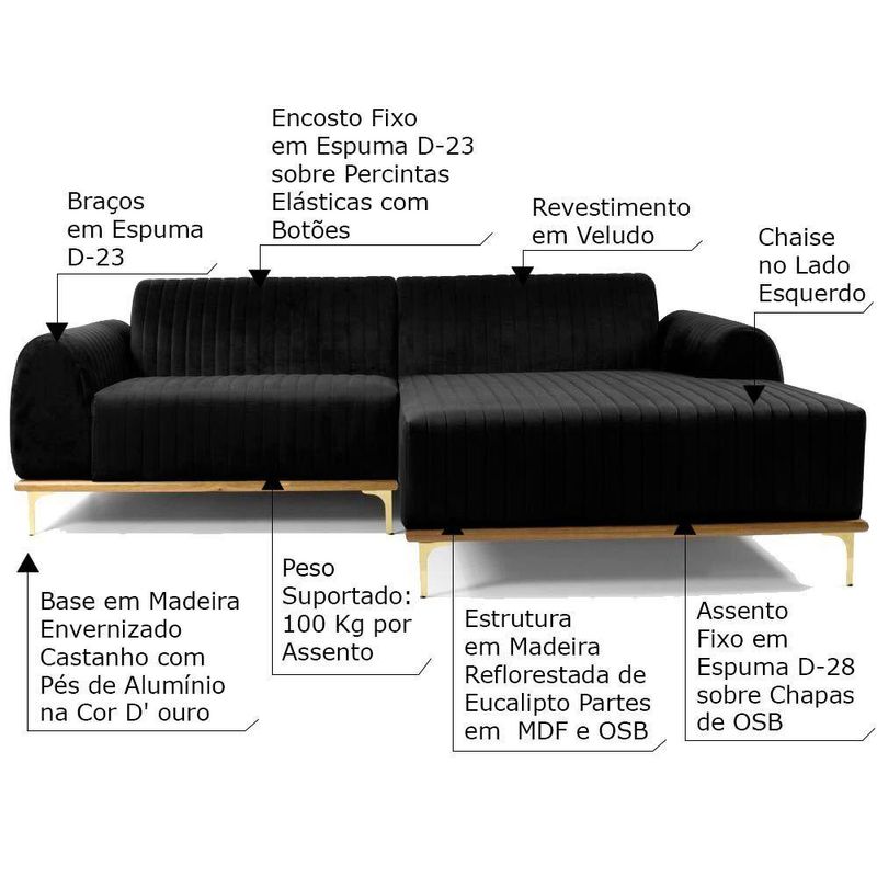 Sofá 3 Lugares com Chaise Base de Madeira Euro 245 Cm Veludo Preto Gran Belo Descrição do Produto:Sofá 3 Lugares com Chaise Esquerdo Base de Madeira Euro 245 cm Veludo Preto Gran Belo Definitivamente a cara da elegância! O Sofá Chaise Euro possui um grande potencial de valorizar o ambiente que é inserido. Para você que deseja elevar o patamar de elegância da sua casa, é a opção ideal. Conforto e estilo sem igual.Dimensões do Produto:Largura: 245 Cm ( 130 cm + 115 cm Chaise);Altura: 76 Cm;Profundidade: 150 Cm;Altura do Encosto: 35 Cm;Altura do Assento: 44 Cm;Profundidade Livre do Assento Chaise: 119 Cm;Altura dos Pés: 16 Cm;Altura do Braço: Interno 19 / Externo 60 cm;Largura do Braço: 25 Cm;Características do Produto:Material da Estrutura:Madeira Reflorestada de Eucalipto, Partes em MDF e OSB;Encosto: Fixo em Espuma D-23, sobre Percintas Elásticas com Botões;Assento: Fixo em Espuma D-28 HR, sobre Chapas de OSB;Braço: Espuma D-23;Material dos Pés: Madeira de Eucalipto;Quantidade de Pés: 04 Pés embutidos;Tipo de Pés:Base em Madeira Envernizado Castanho, com Pés de Alumínio em Coloração D' Ouro;Revestimento: Veludo;Peso Suportado:100 Kg;Conteúdo da Embalagem: 01 Sofá;Necessita de Montagem: Não;Instruções/Cuidado: Utilizar um pano levemente umedecido com água, seguido de pano seco. Evitar exposição ao sol, para que o produto não sofra alterações na cor do tecido. Não limpar com escovas ou produtos abrasivos;Observações Importantes:- As imagens são meramente ilustrativas e não acompanham objetos de decoração e eletros.- Pode haver alguma diferença de tonalidade entre a imagem e o produto, por conta do tratamento de imagens e a calibração de cores da sua tela.- Todos os nossos produtos são enviados devidamente embalados e com total .- Ao receber o produto o cliente deve verificar as condições da embalagem, havendo alguma não assine o de , com a para orientações.- A nossa se responsabilizará pela dos produtos adquiridos até a porta de entrada ou portaria do indicado.- Não nos responsabilizamos, no ato da , por montagens, desmontagens e instalações de produtos, bem como, por subir ou descer escadas/elevadores ou pela utilização de guinchos ou equipamentos es para acesso a pisos superiores em apartamentos, casas ou escritórios. Estas despesas adicionais serão de responsabilidade do cliente.- Confira as dimensões do produto no o da compra e certifique-se de que passará normalmente por elevadores, portas, escadas e/ou corredores, evitando assim futuros desagrados ou imprevistos com a do produto.Marca :GRAN BELOReferência :HUG.245.CHAISE.DIREITA.B300Garantia :90 Dias após o do produto