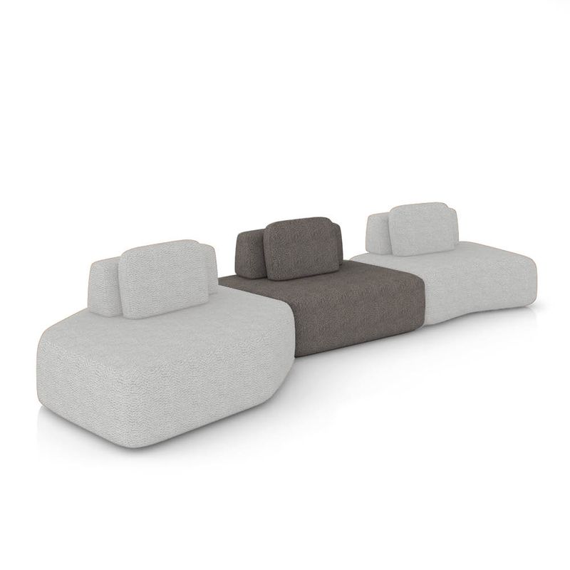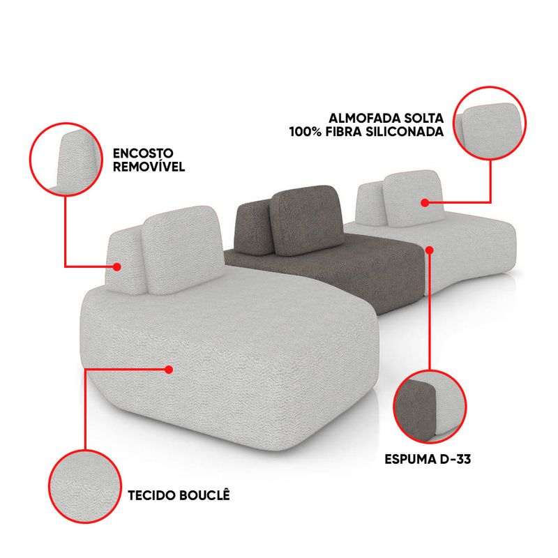 Transforme sua sala de estar com o Sofá 3 Lugares Orgânico Berlim, composto por 01 Módulo Chaise, 01 Módulo Central e 01 Módulo de Canto, com largura total de 480 cm, em uma composição elegante que combina os tons Cinza Claro/Grafite, revestido em Bouclê para um toque macio e visual sofisticado. Seu design moderno e minimalista exibe linhas suaves e contornos arredondados, criando um visual elegante que harmoniza com diferentes estilos de decoração. Por ser modular, o conjunto permite diversas composições: eles podem ser integrados a outros peças para formar sofás amplos ou utilizados separadamente como assentos adicionais. O tecido confere toque macio e aparência sofisticada, enquanto a estrutura em madeira de eucalipto com reforços em MDF assegura resistência e durabilidade prolongada. O assento fixo, composto por molas espirais, percintas elásticas e espuma D-33 de alta densidade, proporciona conforto contínuo. Já o encosto solto (Ilha) e as almofadas extra ampliam a sensação de bem-estar. Um conjunto sofisticado e flexível, ideal para sala de estar, escritório ou espaço de convivência. Dimensões Gerais dos Módulos: Altura Total (base/encosto): 72 cm Largura Total: 480 cm Profundidade: Dê 110 a 140 cm Peso Total: 56 kg Dimensões do Módulo Chaise: Altura Total (base/encosto): 72 cm Largura Total: 165 cm Profundidade: Dê 110 a 140 cm Altura do Assento (do chão): 42 cm Peso Total: 20 kg Dimensões do Módulo Central: Altura Total (base/encosto): 72 cm Largura Total: 140 cm Profundidade: Dê 110 a 140 cm Altura do Assento (do chão): 42 cm Peso Total: 18 kg Dimensões do Módulo Canto: Altura Total (base/encosto): 72 cm Largura Total: 175 cm Profundidade (Variável, conforme a posição do encosto): Dê 110 a 120 cm Altura do Assento (do chão): 42 cm Peso Total: 18 kg Medidas do Encosto e Almofada: Encosto (Ilha): 30cm (A) x 95cm (L) Almofada (Solta): 45cm (A) x 65cm (L) OBSERVAÇÃO IMPORTANTE: Disponibilizamos duas imagens de croqui que demonstram diferentes formas de montagem do sofá. A profundidade dos módulos varia conforme a posição do encosto. Especificações do Produto: Estrutura: Madeira de Eucalipto; Reforços com cantoneiras e chapas em MDF Base: Encosto em fibra siliconada e espuma; assento com percintas elásticas e mola espiral. Espuma do Assento: D-33 (alta qualidade) Revestimento: Bouclê Possui Braços: Não Possui Pés: Sim Material dos Pés: Madeira, fixação por parafusos Possui Rodízios: Não Peso Suportado: Até 150 Kg por módulo Tipo de Encosto: Encosto solto, com enchimento em fibra siliconada Tipo de Assento: Assento fixo, com sustentação de molas e percintas Modularidade: Acompanha almofada solta (100% fibra siliconada); Inclui ilhas com manta acrílica. É Retrátil: Não É Reclinável: Não Diferenciais: Design orgânico e modular, com encosto solto e removível; Módulo independente, podendo ser utilizado sozinho ou combinado com outros módulos da mesma linha. Montagem: O produto é enviado montado Garantia: 90 dias contra defeito de fabricação Instruções de Limpeza: Utilizar um pano limpo e levemente úmido Quantidade de Volumes: 3 Caixas Medida das Embalagens: Caixa 1: 170 x 140 x 65 cm; Caixa 2: 144 x 118 x 65 cm; Caixa 3: 176 x 140 x 65 cm Peso Total das Embalagens: 58 Kg Entrega: É feita somente até o térreo ou portaria. Confira sempre as medidas das embalagens para assegurar que o produto passe por portas e escadas do local.