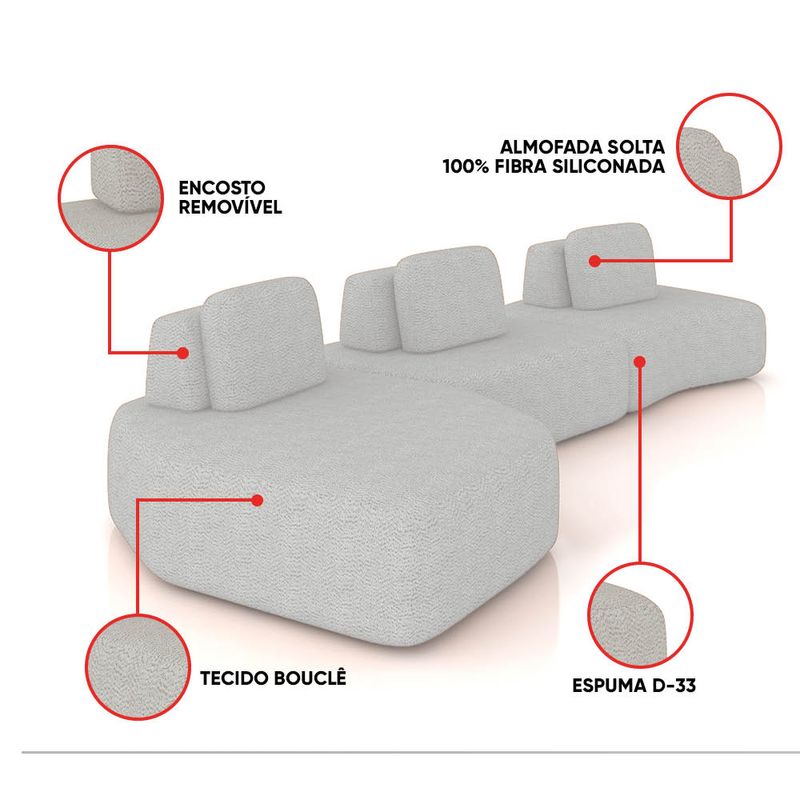 Transforme sua sala de estar com o Sofá 3 Lugares Orgânico Berlim, composto por 01 Módulo Chaise, 01 Módulo Central e 01 Módulo de Canto, com largura total de 480 cm, em uma composição elegante que combina os tons Cinza Claro/Off White, revestido em Bouclê para um toque macio e visual sofisticado. Seu design moderno e minimalista exibe linhas suaves e contornos arredondados, criando um visual elegante que harmoniza com diferentes estilos de decoração. Por ser modular, o conjunto permite diversas composições: eles podem ser integrados a outros peças para formar sofás amplos ou utilizados separadamente como assentos adicionais. O tecido confere toque macio e aparência sofisticada, enquanto a estrutura em madeira de eucalipto com reforços em MDF assegura resistência e durabilidade prolongada. O assento fixo, composto por molas espirais, percintas elásticas e espuma D-33 de alta densidade, proporciona conforto contínuo. Já o encosto solto (Ilha) e as almofadas extra ampliam a sensação de bem-estar. Um conjunto sofisticado e flexível, ideal para sala de estar, escritório ou espaço de convivência. Dimensões Gerais dos Módulos: Altura Total (base/encosto): 72 cm Largura Total: 480 cm Profundidade: Dê 110 a 140 cm Peso Total: 56 kg Dimensões do Módulo Chaise: Altura Total (base/encosto): 72 cm Largura Total: 165 cm Profundidade: Dê 110 a 140 cm Altura do Assento (do chão): 42 cm Peso Total: 20 kg Dimensões do Módulo Central: Altura Total (base/encosto): 72 cm Largura Total: 140 cm Profundidade: Dê 110 a 140 cm Altura do Assento (do chão): 42 cm Peso Total: 18 kg Dimensões do Módulo Canto: Altura Total (base/encosto): 72 cm Largura Total: 175 cm Profundidade (Variável, conforme a posição do encosto): Dê 110 a 120 cm Altura do Assento (do chão): 42 cm Peso Total: 18 kg Medidas do Encosto e Almofada: Encosto (Ilha): 30cm (A) x 95cm (L) Almofada (Solta): 45cm (A) x 65cm (L) OBSERVAÇÃO IMPORTANTE: Disponibilizamos duas imagens de croqui que demonstram diferentes formas de montagem do sofá. A profundidade dos módulos varia conforme a posição do encosto. Especificações do Produto: Estrutura: Madeira de Eucalipto; Reforços com cantoneiras e chapas em MDF Base: Encosto em fibra siliconada e espuma; assento com percintas elásticas e mola espiral. Espuma do Assento: D-33 (alta qualidade) Revestimento: Bouclê Possui Braços: Não Possui Pés: Sim Material dos Pés: Madeira, fixação por parafusos Possui Rodízios: Não Peso Suportado: Até 150 Kg por módulo Tipo de Encosto: Encosto solto, com enchimento em fibra siliconada Tipo de Assento: Assento fixo, com sustentação de molas e percintas Modularidade: Acompanha almofada solta (100% fibra siliconada); Inclui ilhas com manta acrílica. É Retrátil: Não É Reclinável: Não Diferenciais: Design orgânico e modular, com encosto solto e removível; Módulo independente, podendo ser utilizado sozinho ou combinado com outros módulos da mesma linha. Montagem: O produto é enviado montado Garantia: 90 dias contra defeito de fabricação Instruções de Limpeza: Utilizar um pano limpo e levemente úmido Quantidade de Volumes: 3 Caixas Medida das Embalagens: Caixa 1: 170 x 140 x 65 cm; Caixa 2: 144 x 118 x 65 cm; Caixa 3: 176 x 140 x 65 cm Peso Total das Embalagens: 58 Kg Entrega: É feita somente até o térreo ou portaria. Confira sempre as medidas das embalagens para assegurar que o produto passe por portas e escadas do local.