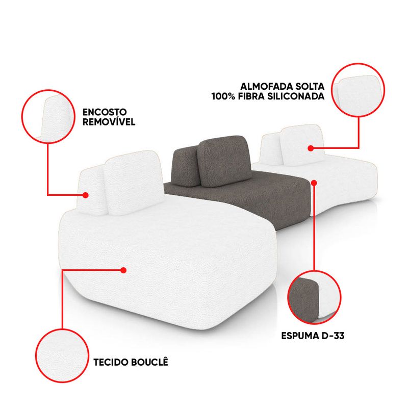 Transforme sua sala de estar com o Sofá 3 Lugares Orgânico Berlim, composto por 01 Módulo Chaise, 01 Módulo Central e 01 Módulo de Canto, com largura total de 480 cm, em uma composição elegante que combina os tons Off White/Grafite, revestido em Bouclê para um toque macio e visual sofisticado. Seu design moderno e minimalista exibe linhas suaves e contornos arredondados, criando um visual elegante que harmoniza com diferentes estilos de decoração. Por ser modular, o conjunto permite diversas composições: eles podem ser integrados a outros peças para formar sofás amplos ou utilizados separadamente como assentos adicionais. O tecido confere toque macio e aparência sofisticada, enquanto a estrutura em madeira de eucalipto com reforços em MDF assegura resistência e durabilidade prolongada. O assento fixo, composto por molas espirais, percintas elásticas e espuma D-33 de alta densidade, proporciona conforto contínuo. Já o encosto solto (Ilha) e as almofadas extra ampliam a sensação de bem-estar. Um conjunto sofisticado e flexível, ideal para sala de estar, escritório ou espaço de convivência. Dimensões Gerais dos Módulos: Altura Total (base/encosto): 72 cm Largura Total: 480 cm Profundidade: Dê 110 a 140 cm Peso Total: 56 kg Dimensões do Módulo Chaise: Altura Total (base/encosto): 72 cm Largura Total: 165 cm Profundidade: Dê 110 a 140 cm Altura do Assento (do chão): 42 cm Peso Total: 20 kg Dimensões do Módulo Central: Altura Total (base/encosto): 72 cm Largura Total: 140 cm Profundidade: Dê 110 a 140 cm Altura do Assento (do chão): 42 cm Peso Total: 18 kg Dimensões do Módulo Canto: Altura Total (base/encosto): 72 cm Largura Total: 175 cm Profundidade (Variável, conforme a posição do encosto): Dê 110 a 120 cm Altura do Assento (do chão): 42 cm Peso Total: 18 kg Medidas do Encosto e Almofada: Encosto (Ilha): 30cm (A) x 95cm (L) Almofada (Solta): 45cm (A) x 65cm (L) OBSERVAÇÃO IMPORTANTE: Disponibilizamos duas imagens de croqui que demonstram diferentes formas de montagem do sofá. A profundidade dos módulos varia conforme a posição do encosto. Especificações do Produto: Estrutura: Madeira de Eucalipto; Reforços com cantoneiras e chapas em MDF Base: Encosto em fibra siliconada e espuma; assento com percintas elásticas e mola espiral. Espuma do Assento: D-33 (alta qualidade) Revestimento: Bouclê Possui Braços: Não Possui Pés: Sim Material dos Pés: Madeira, fixação por parafusos Possui Rodízios: Não Peso Suportado: Até 150 Kg por módulo Tipo de Encosto: Encosto solto, com enchimento em fibra siliconada Tipo de Assento: Assento fixo, com sustentação de molas e percintas Modularidade: Acompanha almofada solta (100% fibra siliconada); Inclui ilhas com manta acrílica. É Retrátil: Não É Reclinável: Não Diferenciais: Design orgânico e modular, com encosto solto e removível; Módulo independente, podendo ser utilizado sozinho ou combinado com outros módulos da mesma linha. Montagem: O produto é enviado montado Garantia: 90 dias contra defeito de fabricação Instruções de Limpeza: Utilizar um pano limpo e levemente úmido Quantidade de Volumes: 3 Caixas Medida das Embalagens: Caixa 1: 170 x 140 x 65 cm; Caixa 2: 144 x 118 x 65 cm; Caixa 3: 176 x 140 x 65 cm Peso Total das Embalagens: 58 Kg Entrega: É feita somente até o térreo ou portaria. Confira sempre as medidas das embalagens para assegurar que o produto passe por portas e escadas do local.