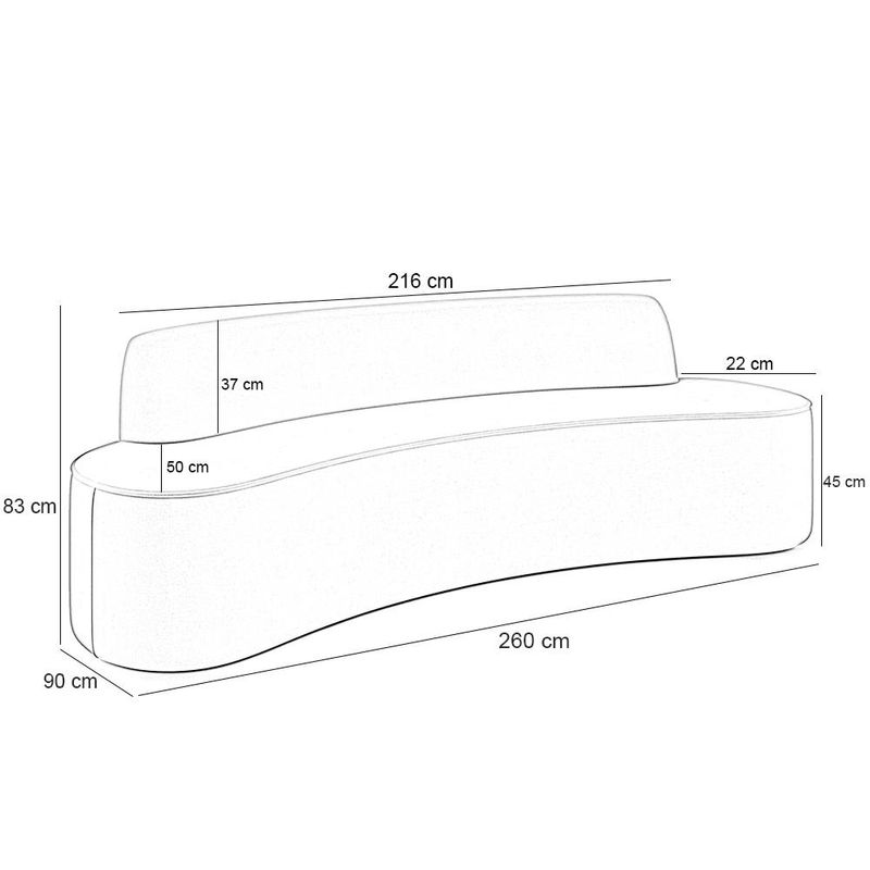 Venha conhecer o sofá mais elegante da atualidade. O Sofá Cancún é considerado uma peça versátil e sofisticada que se adapta perfeitamente a diversos ambientes. Seja em residências, eventos especiais ou espaços comerciais, ele se destaca pela sua elegância e funcionalidade. Seu formato curvo em meia lua cria um visual encantador, proporcionando um toque de originalidade e modernidade ao ambiente. Além disso, sua estrutura robusta e durável garante conforto e resistência, garantindo que o sofá possa ser desfrutado por muito tempo. O revestimento de alta qualidade é um dos grandes diferenciais deste sofá. Feito com materiais selecionados, ele oferece uma textura suave ao toque e é fácil de limpar, mantendo a aparência sempre impecável. Seja qual for o ambiente em que você deseja adicionar um toque de estilo e conforto, o sofá com design curvo é a opção certa. Sua beleza única e funcionalidade prática combinam perfeitamente, tornando-o um investimento valioso para qualquer espaço. Dimensões do produto (L x A x P) 260 cm x 83 cm x 90 cm Medidas internas Altura do encosto: 37 cm Altura do chão ao assento: 45 cm Largura do encosto: 216 cm Profundidade do assento: 50 cm Peso aproximado: 40 kg Características: Estrutura fabricada com madeira de eucalipto tratado, MDF e OSB unidos com grampos galvanizados. Percinta elástica de nylon. Espuma certificada, encosto revestido com em D-23, assento D-28. Revestimento em Couríssimo. Acabamento com costura rebatida, garantindo maior resistência a abertura de costuras. Sapatas plásticas. Suporta até 100 kg por assento. - Por se tratar de estofado as medidas podem ter uma pequena variação de até 3 cm. - A tonalidade do produto real poderá ter ligeira variação devido o lote de tecidos. Observações importantes: - A montagem será de responsabilidade do comprador. - Responsabilizamo-nos pela entrega em todo território nacional, até onde as rodovias alcançam, entregas fluviais ou aéreas devem ser cotadas a parte. - As imagens são ilustrativas, não acompanham objetos de decoração e eletrônicos. - Não nos responsabilizamos, no ato da entrega, por subir escadas/elevadores ou transporte por guincho em apartamentos. - Eventuais despesas são de responsabilidade do comprador. - Confira as dimensões do produto e certifique-se de que passará normalmente por supostos elevadores, portas, escadas e/ou corredores de sua residência.