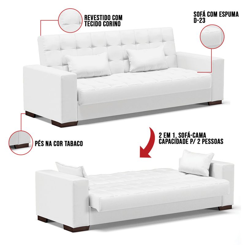 Na hora de escolher o modelo de sofá ideal para sua casa é preciso ter um cuidado especial, afinal de contas é uma peça de grande destaque na decoração. O nosso lindo Sofá Cama 2 Lugares Lisboa, sem dúvidas é uma boa opção. Com um estilo mais retrô, remete a boas lembranças e recordações da infância, como por exemplo, a casa da vó, brincadeiras e momentos em família não é mesmo? E se você quer ter essas boas sensações, essa é a escolha certa. Produzido em Madeira de Eucalipto e tem sua estrutura sustentada por parafusos zincados e grampos galvanizados, o estofamento é feito com espuma D-23, com tecido Linho na cor Branco, seu assento é composto com percintas elásticas o que garante maior durabilidade e conforto. Além de garantir a criação de um espaço confortável, o sofá Lisboa irá adicionar um toque luxuoso e aconchegante ao seu ambiente. Marcante por si só né! Escolha o seu. Dimensões Sofá Altura total: 80 cm Largura total: 210 cm Profundidade total: 121 cm Peso: 52 kg Especificações do Produto: Estrutura: Madeira Eucalipto Espuma: D-23 Tecido: CorinoTipo de pés: Madeira Peso suportado: Até 180 Kg Diferenciais: 2 Posições, Assento Retrátil Garantia: 90 dias contra defeito de fabricação Montagem: O produto vai montado, apenas parafusar os pés Instruções de limpeza: Utilizar um pano limpo e levemente úmido Você irá receber: 01 Volume com 01 Sofá Observações Relevantes - Todos os produtos vão embalados com total segurança; - As cores dos produtos podem sofrer alterações dependendo do seu monitor; - Para futuras compras, não garantimos a mesma tonalidade de cor, pois existe variação a cada lote do fabricante do tecido; - As imagens são meramente ilustrativas, não acompanham objetos de decoração e eletros; - Confira as dimensões do produto no momento da compra e certifique-se de que passará normalmente por escadas, elevadores, portas e corredores; - Importante: Por se tratar de estofado as medidas podem ter uma pequena variação em até 3 cm; - Não nos responsabilizamos no ato da entrega por montagens, desmontagens, instalações de produtos; - Não nos responsabilizamos no ato da entrega por subir escadas, elevadores, nem utilização de guinchos ou equipamentos similares para acesso a pisos superiores em apartamentos; - A entrega do produto é realizada em todo território nacional, até onde as rodovias alcançam, entregas fluviais ou aéreas devem ser cotadas a parte; - Observando as orientações acima, evita-se futuros desagrados ou imprevistos com a entrega do produto. Havendo despesas adicionais, serão de responsabilidade do cliente;