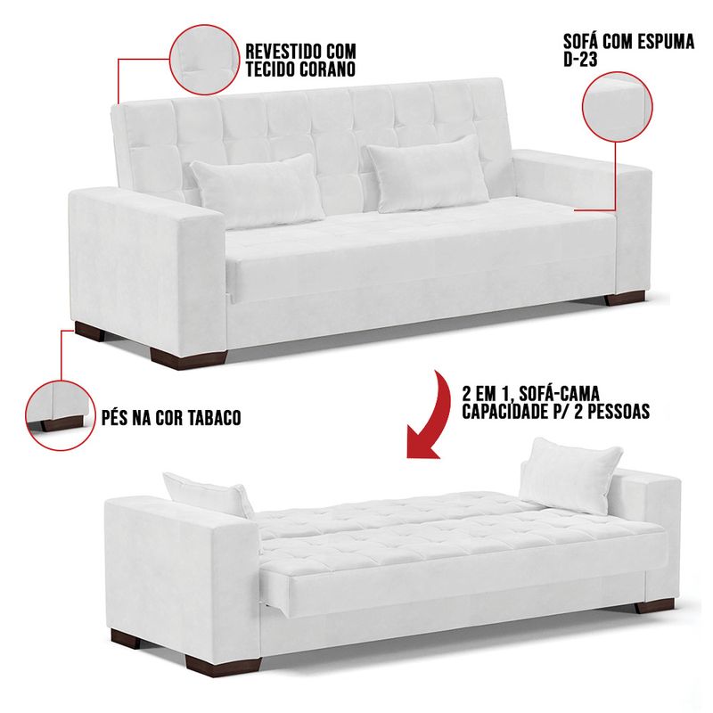 Na hora de escolher o modelo de sofá ideal para sua casa é preciso ter um cuidado especial, afinal de contas é uma peça de grande destaque na decoração. O nosso lindo Sofá Cama Casal 3 Lugares Lisboa, sem dúvidas é uma boa opção. Com um estilo mais retrô, remete a boas lembranças e recordações da infância, como por exemplo, a casa da vó, brincadeiras e momentos em família não é mesmo? E se você quer ter essas boas sensações, essa é a escolha certa. Produzido em Madeira de Eucalipto e tem sua estrutura sustentada por parafusos zincados e grampos galvanizados, o estofamento é feito com espuma D-23, com tecido Corano, seu assento é composto com percintas elásticas o que garante maior durabilidade e conforto. Além de garantir a criação de um espaço confortável, o sofá Lisboa irá adicionar um toque luxuoso e aconchegante ao seu ambiente. Marcante por si só né! Escolha o seu. Dimensões Sofá Altura total: 80 cm Largura total: 210 cm Profundidade total: 121 cm Peso: 52 kg Especificações do Produto: Estrutura: Madeira Eucalipto Espuma: D-23 Tecido: Corano Tipo de pés: Polipropileno de Alta Resistência Peso suportado: Até 180 Kg Diferenciais: 2 Posições, Assento Retrátil Garantia: 90 dias contra defeito de fabricação Montagem: O produto vai montado, apenas parafusar os pés Instruções de limpeza: Utilizar um pano limpo e levemente úmido Você irá receber: 01 Volume com 01 Sofá Observações Relevantes - Todos os produtos vão embalados com total segurança; - As cores dos produtos podem sofrer alterações dependendo do seu monitor; - Para futuras compras, não garantimos a mesma tonalidade de cor, pois existe variação a cada lote do fabricante do tecido; - As imagens são meramente ilustrativas, não acompanham objetos de decoração e eletros; - Confira as dimensões do produto no momento da compra e certifique-se de que passará normalmente por escadas, elevadores, portas e corredores; - Importante: Por se tratar de estofado as medidas podem ter uma pequena variação em até 3 cm; - Não nos responsabilizamos no ato da entrega por montagens, desmontagens, instalações de produtos; - Não nos responsabilizamos no ato da entrega por subir escadas, elevadores, nem utilização de guinchos ou equipamentos similares para acesso a pisos superiores em apartamentos; - A entrega do produto é realizada em todo território nacional, até onde as rodovias alcançam, entregas fluviais ou aéreas devem ser cotadas a parte; - Observando as orientações acima, evita-se futuros desagrados ou imprevistos com a entrega do produto. Havendo despesas adicionais, serão de responsabilidade do cliente;