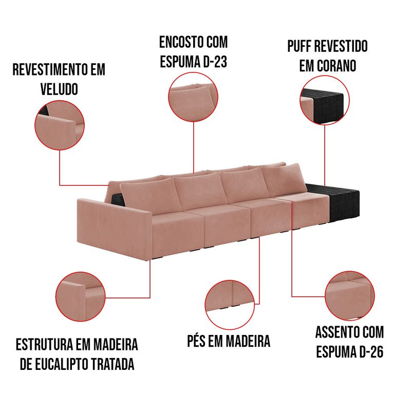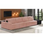 O Sofá Ilha 4 Lugares Living Lary de 512 cm é uma peça de destaque para qualquer ambiente, com um design moderno este sofá apresenta uma estrutura modular permitindo reorganizá-la criando um layout personalizado. Revestido no luxuoso tecido Veludo em um tom envolvente de Rosê, proporcionando uma sensação de aconchego e sofisticação. Seu assento é fixo em espuma D-26 com multimolas de sustentação espiral e ensacadas, solda dupla, manta acrílica e percintas elásticas, suportando até 150 kg por assento. Já o encosto possui espuma D-23 sendo ele removível, com almofadas soltas preenchidas com 100% de fibra siliconada, proporcionando um apoio macio para as costas. Os pés são feitos em madeira certificando maior estabilidade ao móvel. Este sofá apresenta características de alta qualidade, incluindo uma estrutura de madeira tratada de eucalipto reflorestada, garantindo maior resistência e durabilidade ao produto, além de contribuir para a sustentabilidade ambiental. Com nove assentos no total, um deles revestido em tecido Sintético Pu Preto com detalhes em gomos feito com a técnica de costura pespontos, este sofá oferece espaço suficiente para acomodar confortavelmente até dez pessoas, tornando-o ideal para receber amigos e familiares com estilo e conforto. Pode ser utilizado em escritórios, restaurantes e demais ambientes corporativos.O Sofá Lary é a escolha perfeita para quem busca uma peça de mobiliário que une funcionalidade, conforto e estilo em uma única solução para o seu ambiente. Aproveite! Dimensões do Produto: Altura Total: 82 cm Largura Total: 512 cm Profundidade Total: 160 cm Peso: 216 kg Largura do Braço: 12 cm Largura do Assento: 110 cm Profundidade do Assento: Variável. Altera de acordo com a posição do encosto Outras Medidas: 1x Módulo Lateral com Braço: 122 x 82 x 160 cm 2x Módulo Central: 110 x 82 x 160 cm Largura do Puff: 60 x 45 x 160 cm Altura do chão ao Assento: 45 cm Altura do Encosto: 37 cm Especificações do Produto: Estrutura: Madeira de Reflorestamento Tratada (Eucalipto) Espuma do Encosto: D-23, ajustável Espuma do Assento: D-26 Molas Ensacadas e Espirais com Percintas/Manta Acrílica Revestimento: Veludo Possui Pés: Sim Tipo de Pés: Madeira Detalhes/Aplicações: Acompanha Almofadas Soltas 100% Fibras Siliconadas - Manta Acrílica Peso Suportado: Até 150 Kg por assento Quantidade de Assentos: 9 Assentos Quantidade de Lugares: Até 10 Lugares Tipo de Encosto: Móvel Tipo de Assento: Fixo É retrátil: Não É reclinável: Não Complexidade da Montagem: Baixo Diferenciais: Sofá modular, estilo ilha, pode ser aproveitado assentos em ambos os lados. Acompanha almofadas. Ideal para sala de estar, living e ambientes integrados Montagem: O produto é enviado montado, sendo necessário apenas a junção dos módulos. Garantia: 90 dias contra defeito de fabricação Instruções de Limpeza: Utilizar um pano limpo e levemente úmido Você irá Receber: 01 Sofá Entregue em: 05 Volumes