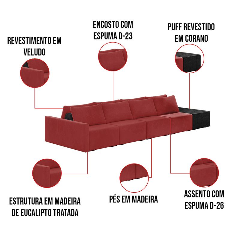 O Sofá Ilha 4 Lugares Living Lary de 512 cm é uma peça de destaque para qualquer ambiente, com um design moderno este sofá apresenta uma estrutura modular permitindo reorganizá-la criando um layout personalizado. Revestido no luxuoso tecido Veludo em um tom envolvente de Vermelho, proporcionando uma sensação de aconchego e sofisticação. Seu assento é fixo em espuma D-26 com multimolas de sustentação espiral e ensacadas, solda dupla, manta acrílica e percintas elásticas, suportando até 150 kg por assento. Já o encosto possui espuma D-23 sendo ele removível, com almofadas soltas preenchidas com 100% de fibra siliconada, proporcionando um apoio macio para as costas. Os pés são feitos em madeira certificando maior estabilidade ao móvel. Este sofá apresenta características de alta qualidade, incluindo uma estrutura de madeira tratada de eucalipto reflorestada, garantindo maior resistência e durabilidade ao produto, além de contribuir para a sustentabilidade ambiental. Com nove assentos no total, um deles revestido em tecido Sintético Pu Preto com detalhes em gomos feito com a técnica de costura pespontos, este sofá oferece espaço suficiente para acomodar confortavelmente até dez pessoas, tornando-o ideal para receber amigos e familiares com estilo e conforto. Pode ser utilizado em escritórios, restaurantes e demais ambientes corporativos.O Sofá Lary é a escolha perfeita para quem busca uma peça de mobiliário que une funcionalidade, conforto e estilo em uma única solução para o seu ambiente. Aproveite! Dimensões do Produto: Altura Total: 82 cm Largura Total: 512 cm Profundidade Total: 160 cm Peso: 216 kg Largura do Braço: 12 cm Largura do Assento: 110 cm Profundidade do Assento: Variável. Altera de acordo com a posição do encosto Outras Medidas: 1x Módulo Lateral com Braço: 122 x 82 x 160 cm 2x Módulo Central: 110 x 82 x 160 cm Largura do Puff: 60 x 45 x 160 cm Altura do chão ao Assento: 45 cm Altura do Encosto: 37 cm Especificações do Produto: Estrutura: Madeira de Reflorestamento Tratada (Eucalipto) Espuma do Encosto: D-23, ajustável Espuma do Assento: D-26 Molas Ensacadas e Espirais com Percintas/Manta Acrílica Revestimento: Veludo Possui Pés: Sim Tipo de Pés: Madeira Detalhes/Aplicações: Acompanha Almofadas Soltas 100% Fibras Siliconadas - Manta Acrílica Peso Suportado: Até 150 Kg por assento Quantidade de Assentos: 9 Assentos Quantidade de Lugares: Até 10 Lugares Tipo de Encosto: Móvel Tipo de Assento: Fixo É retrátil: Não É reclinável: Não Complexidade da Montagem: Baixo Diferenciais: Sofá modular, estilo ilha, pode ser aproveitado assentos em ambos os lados. Acompanha almofadas. Ideal para sala de estar, living e ambientes integrados Montagem: O produto é enviado montado, sendo necessário apenas a junção dos módulos. Garantia: 90 dias contra defeito de fabricação Instruções de Limpeza: Utilizar um pano limpo e levemente úmido Você irá Receber: 01 Sofá Entregue em: 05 Volumes