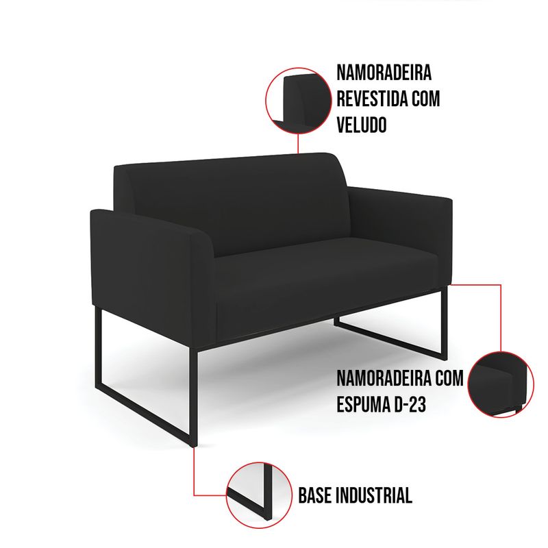 Todo mundo gosta de um ambiente bem decorado, e se for novidade melhor ainda não é mesmo? A D?Rossi, além de entregar beleza, qualidade e confiança aos clientes, ela dispõe das melhores opções em produtos, disponíveis no mercado! Se você quer um produto sofisticado, opte pelo Sofá Namoradeira Marisa. Ele dispõe de um tom lindo no Preto, uma cor leve, neutra e delicada que combina com qualquer estilo de decoração. Esta mobília fica perfeita na sala, escritório, quarto, varanda coberta e onde mais preferir! Sua estrutura é feita em madeira reforçada de eucalipto proveniente de reflorestamento. No assento/encosto contém um revestimento no tecido Veludo, com estofamento em espuma prorelax D-23, garantindo maior conforto ao usuário. A sustentação da peça é dada pelos Base Industrial Preto, garantindo uma resistência melhor, para relaxar o dia todo com mais comodidade. O Sofá Namoradeira Marisa é ideal, para dar aquele realce que seu ambiente precisa. Tenho certeza que, esse móvel é a melhor compra que você irá fazer. Garanta já seu Sofá Namoradeira e se acomode da melhor maneira possível! Dimensões do Sofá Namoradeira: Altura total: 81 cm Largura total: 114 cm Profundidade total: 64 cm Altura do encosto: 36 cm Largura do assento: 96 cm Profundidade do assento: 48 cm Altura do chão ao assento: 45 cm Espessura do assento: 18 cm Tamanho dos pés: 30 cm Espessura do braço: 9 cm Peso: 22 kg Especificações do Produto Estrutura: Madeira Eucalipto Espuma: D-23 Tecido: Veludo Tipo de pés: Base Industrial Preto Peso suportado: Até 120 Kg Garantia: 90 dias contra defeito de fabricação Montagem: O produto vai montado, apenas parafusar a base Instruções de limpeza: Utilizar um pano limpo e levemente úmido Você irá receber: 01 Sofá Namoradeira - Entregue em: 01 Volume Observações Relevantes - Todos os produtos vão embalados com total segurança; - As cores dos produtos podem sofrer alterações dependendo do seu monitor; - Para futuras compras, não garantimos a mesma tonalidade de cor, pois existe variação a cada lote do fabricante do tecido; - As imagens são meramente ilustrativas, não acompanham objetos de decoração e eletros; - Confira as dimensões do produto no momento da compra e certifique-se de que passará normalmente por escadas, elevadores, portas e corredores; - Importante: Por se tratar de estofado as medidas podem ter uma pequena variação em até 3 cm; - Não nos responsabilizamos no ato da entrega por montagens, desmontagens, instalações de produtos; - Não nos responsabilizamos no ato da entrega por subir escadas, elevadores, nem utilização de guinchos ou equipamentos similares para acesso a pisos superiores em apartamentos; - A entrega do produto é realizada em todo território nacional, até onde as rodovias alcançam, entregas fluviais ou aéreas devem ser cotadas a parte; - Observando as orientações acima, evita-se futuros desagrados ou imprevistos com a entrega do produto. Havendo despesas adicionais, serão de responsabilidade do cliente;