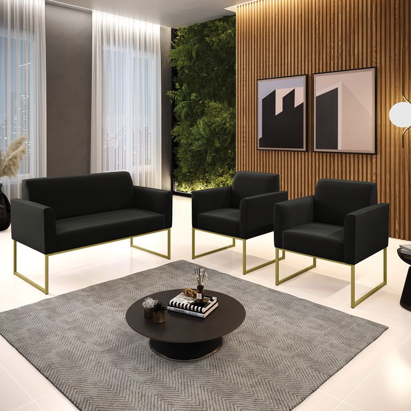 Todo mundo gosta de um ambiente bem decorado, e se for novidade melhor ainda não é mesmo? A D?Rossi, além de entregar beleza, qualidade e confiança aos clientes, ela dispõe das melhores opções em produtos, disponíveis no mercado! Se você quer um produto sofisticado, opte pelo Sofá Namoradeira com Poltrona Marisa. Este kit dispõe de um tom lindo no Preto, uma cor leve, neutra e delicada que combina com qualquer estilo de decoração. Ele fica perfeito na sala, escritório, quarto, varanda coberta e onde mais preferir! Sua estrutura é feita em madeira reforçada de eucalipto proveniente de reflorestamento. No assento/encosto contém um revestimento no tecido Suede, com estofamento em espuma prorelax D-23, garantindo maior conforto ao usuário. A sustentação da peça é dada pela Base Industrial Dourado, garantindo uma resistência melhor, para relaxar o dia todo com mais comodidade. O Sofá Namoradeira com Poltrona Marisa é ideal, para dar aquele realce que seu ambiente precisa. Tenho certeza que, esse móvel é a melhor compra que você irá fazer. Garanta já seu Kit e se acomode da melhor maneira possível! Dimensões do Sofá Namoradeira: Altura total: 81 cm Largura total: 114 cm Profundidade total: 64 cm Altura do encosto: 36 cm Largura do assento: 96 cm Profundidade do assento: 48 cm Altura do chão ao assento: 45 cm Espessura do assento: 18 cm Tamanho dos pés: 30 cm Espessura do braço: 9 cm Peso: 22 kg Dimensões da Poltrona: Altura total: 81 cm Largura total: 64 cm Profundidade total: 64 cm Altura do encosto: 36 cm Largura do assento: 47 cm Profundidade do assento: 48 cm Altura do chão ao assento: 45 cm Espessura do assento: 18 cm Tamanho dos pés: 30 cm Espessura do braço: 9 cm Peso: 16 kg Especificações do Produto Estrutura: Madeira Eucalipto Espuma: D-23 Tecido: Suede Tipo de pés: Base Industrial Dourado Peso suportado: Até 120 Kg Garantia: 90 dias contra defeito de fabricação Montagem: O produto vai montado, apenas parafusar a base Instruções de limpeza: Utilizar um pano limpo e levemente úmido Você irá receber: 01 Sofá Namoradeira e 02 Poltronas - Entregue em 03 Volumes Observações Relevantes - Todos os produtos vão embalados com total segurança; - As cores dos produtos podem sofrer alterações dependendo do seu monitor; - Para futuras compras, não garantimos a mesma tonalidade de cor, pois existe variação a cada lote do fabricante do tecido; - As imagens são meramente ilustrativas, não acompanham objetos de decoração e eletros; - Confira as dimensões do produto no momento da compra e certifique-se de que passará normalmente por escadas, elevadores, portas e corredores; - Importante: Por se tratar de estofado as medidas podem ter uma pequena variação em até 3 cm; - Não nos responsabilizamos no ato da entrega por montagens, desmontagens, instalações de produtos; - Não nos responsabilizamos no ato da entrega por subir escadas, elevadores, nem utilização de guinchos ou equipamentos similares para acesso a pisos superiores em apartamentos; - A entrega do produto é realizada em todo território nacional, até onde as rodovias alcançam, entregas fluviais ou aéreas devem ser cotadas a parte; - Observando as orientações acima, evita-se futuros desagrados ou imprevistos com a entrega do produto. Havendo despesas adicionais, serão de responsabilidade do cliente;