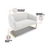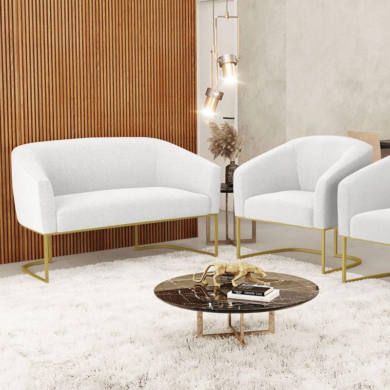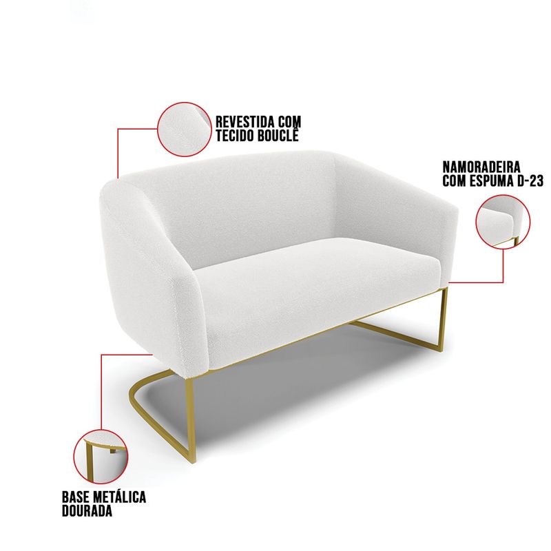 O Sofá Namoradeira 2 lugares com Potrona Stella é uma peça que combina elegância, conforto e durabilidade. Este conjunto tem um design moderno e sofisticado, com Base Industrial Dourado e revestimento em tecido Bouclê Off White, que harmonizam com qualquer ambiente. Ele é ideal para sala de estar, recepções, mesa de jantar ou qualquer outro espaço que você queira decorar com estilo e bom gosto. Ele tem uma estrutura em madeira de reflorestamento eucalipto, que garante a resistência e a sustentabilidade do produto. Ele suporta até 120 kg de peso, podendo ser utilizado por pessoas de diferentes biotipos. Ele tem um acabamento reforçado e espuma de qualidade D23, que oferece maciez e aconchego. Tem pés em aço carbono e pintura eletrostática, que protegem o produto contra corrosão e desgaste. Ele tem assento com persintas elásticas, que proporcionam flexibilidade e conforto. O kit Stella é um produto de alta qualidade, beleza e funcionalidade. Ele é fácil de transportar, pois tem um peso leve e um tamanho compacto. O Sofá Namoradeira 2 lugares com Potrona Stella é um produto que vai fazer a diferença na sua decoração e no seu bem-estar. Ele vai trazer charme, conforto e durabilidade para o seu ambiente. Aproveite essa oferta e leve para casa um Sofá Namoradeira 2 lugares com Potrona qualidade por um preço incrível. Essa é a sua chance de ter um kit maravilhoso por um preço imperdível. Corra e garanta seu Sofá Namoradeira 2 lugares com Potrona antes que acabe o estoque! Dimensões da Poltrona: Altura total: 81 cm Largura total: 68 cm Profundidade total: 60 cm Altura do encosto: 40 cm Largura do assento: 45 cm Profundidade do assento: 45 cm Altura do chão ao assento: 45 cm Espessura do assento: 15 cm Tamanho dos pés: 30 cm Altura do chão ao braço: 70 cm Altura interna do braço: 28 cm Espessura do braço: 7 cm Peso: 21 kg Dimensões da Namoradeira: Altura total: 80 cm Largura total: 120 cm Profundidade total: 63 cm Altura do encosto: 39 cm Largura do assento: 100 cm Profundidade do assento: 45 cm Altura do chão ao assento: 45 cm Espessura do assento: 15 cm Altura do chão ao braço: 70 cm Altura interna do braço: 25 cm Tamanho dos pés: 30 cm Espessura do braço: 7 cm Peso: 21 kg Especificações do Produto Estrutura: Madeira Eucalipto Espuma: D-23 Tecido: Corino Tipo de pés: Base Industrial Dourada Peso suportado: Até 120 Kg Garantia: 90 dias contra defeito de fabricação Montagem: O produto vai montado, apenas parafusar a base Instruções de limpeza: Utilizar um pano limpo e levemente úmido Você irá receber: 01 Sofá Namoradeira e 01 Poltrona - Entregue em: 02 Volumes