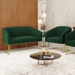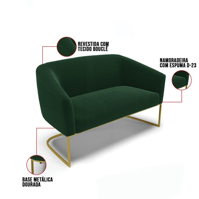 Tem novidades chegando por aqui! Olha só essa nossa inédita Namoradeira e Poltrona Stella Bouclê. Sim, as melhores opções em Namoradeira estão aqui! A Namoradeira e Poltrona Stella Bouclê é para todas as ocasiões, é ideal para você relaxar, assistir tv ou ler um livro, mantendo-o confortável ao longo do dia! Um estofado versátil, que foge do convencional pelo seu design e tecido luxuoso. Seu formato curvo, marcante e sofisticado, oferece conforto de forma excepcional, com aquela sensação de abraço, que deixa o coração quentinho! Desenvolvida com atenção aos detalhes, para atender todas suas expectativas e necessidades. Seu aspecto arredondado e anatômico, possibilita que a postura fique sempre alinhada, mantendo a coluna na posição correta. Ela dispõe de um acabamento impecável, revestida em Bouclê em tom Verde, um tecido maleável que além de ser muito bonito, é a grande tendência do momento, por ser uma lã mais refinada, quente, com toque suave e agradável, semelhante à textura natural da ovelha. Contém uma estrutura robusta, sua sustentação é dada pela Base Industrial no tom Dourado, que garantem mais segurança e firmeza ao sentar-se. Já o enchimento é feito em espuma D-23 no encosto e assento, garantindo maior conforto ao usuário. Ah! Vale a pena lembrar que a Namoradeira e Poltrona Stella Bouclê, foi produzida em quantidades limitadas, para aqueles que procuram criar um visual diferenciado e exclusivo. Então, não deixe de aproveitar esse lançamento, hem! Leve a sua agora mesmo. Dimensões da Poltrona: Altura Total: 81 cm Largura Total: 68 cm Profundidade Total: 60 cm Altura do Encosto: 40 cm Largura do Assento: 45 cm Profundidade do Assento: 45 cm Altura do chão ao Assento: 45 cm Espessura do Assento: 15 cm Espessura do braço: 7 cm Altura do chão ao braço: 70 cm Altura interna do braço: 28 cm Tamanho dos pés: 30 cm Peso: 18 kg Dimensões da Namoradeira: Altura Total: 80 cm Largura Total: 120 cm Profundidade Total: 63 cm Altura do Encosto: 39 cm Largura do Assento: 100 cm Profundidade do Assento: 45 cm Altura do chão ao Assento: 45 cm Espessura do Assento: 15 cm Espessura do braço: 7 cm Altura do chão ao braço: 70 cm Altura interna do braço: 25 cm Tamanho dos pés: 30 cm Peso: 26 kg Especificações do Produto: Estrutura: Madeira Eucalipto Espuma: D-23 Tecido: Bouclê Peso Suportado: Até 180 Kg Tipo de Pés: Base Industrial Dourado Tipo de Encosto: Fixo Tipo de Assento: Fixo Complexidade da Montagem: Baixo Montagem: O produto vai montado, apenas parafusar a base Garantia: 90 dias contra defeito de fabricação Instruções de Limpeza: Utilizar um pano limpo e levemente úmido Você irá Receber: 01 Sofá Namoradeira e 01 Poltrona - Entregue em: 02 Volumes